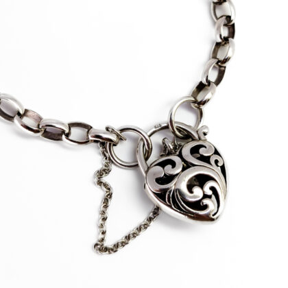 Sterling Silver Oval-Belcher Bracelet with CZ Filigree Puff Heart Clasp #68493