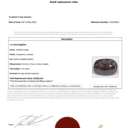 Natural Reddish Orange Sapphire 3.74ct Cushion Cut Loose Stone #59074-7