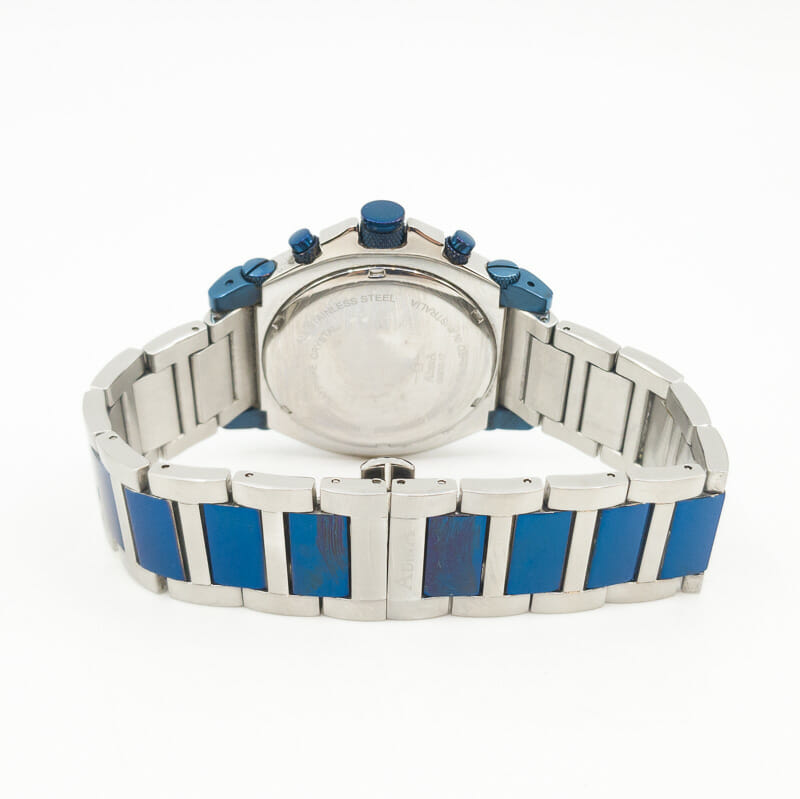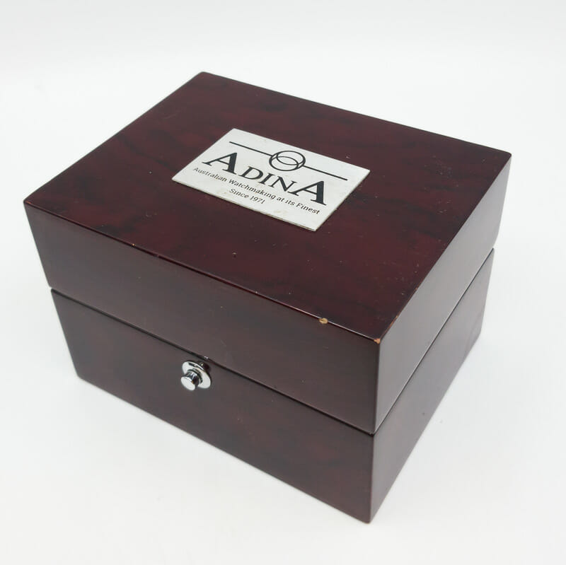 This Adina chronograph has a classic sports inspired design with stainless steel band. It comes in the wooden Adina watch box. As a pre-loved watch there is a bit of wear to the band and case, with some red marks around the clasp as shown in the photos.