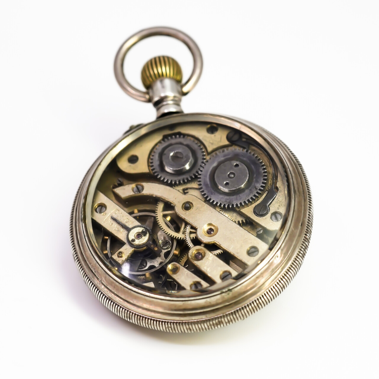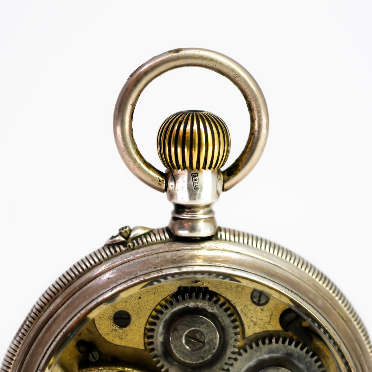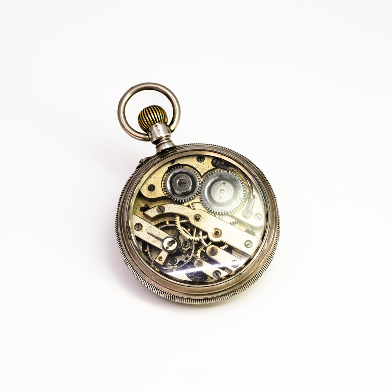 An antique Chinese market 8-day pocket watch with moonphase complication, housed in an 800 (80% silver) case. The watch has been serviced and runs well, featuring a rare custom clear exhibition back that reveals the intricate mechanical movement.