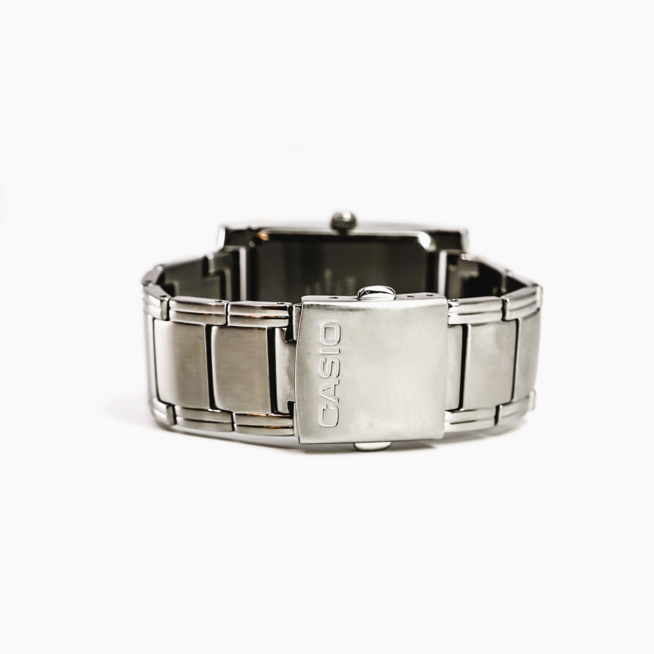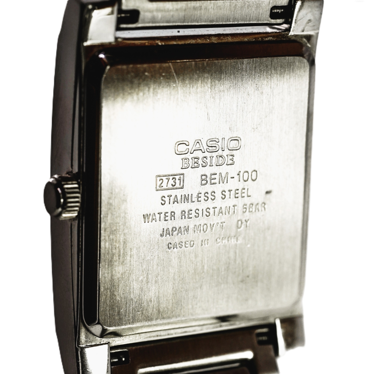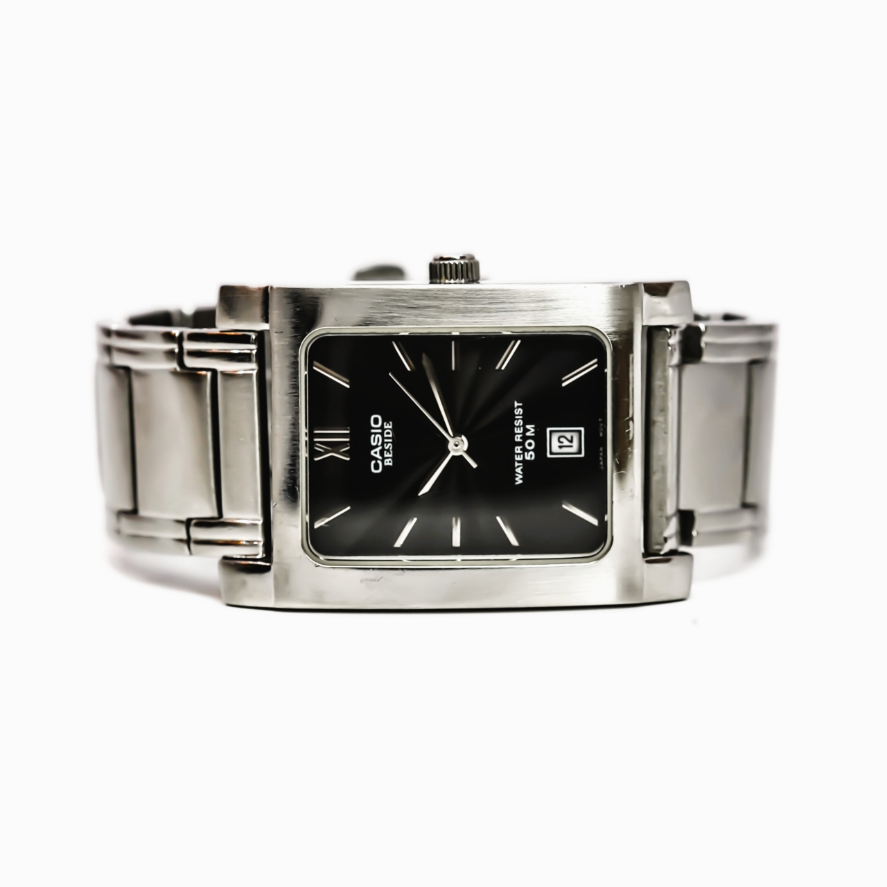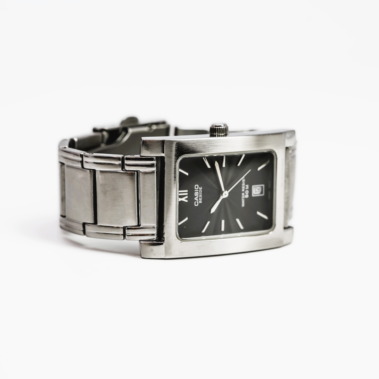 This Casio Beside BEM-100 is a sleek, rectangular stainless steel watch with a minimalist black dial and subtle sunburst texture. The design is classic and understated, making it easy to wear as an everyday watch or as a simple dress option.