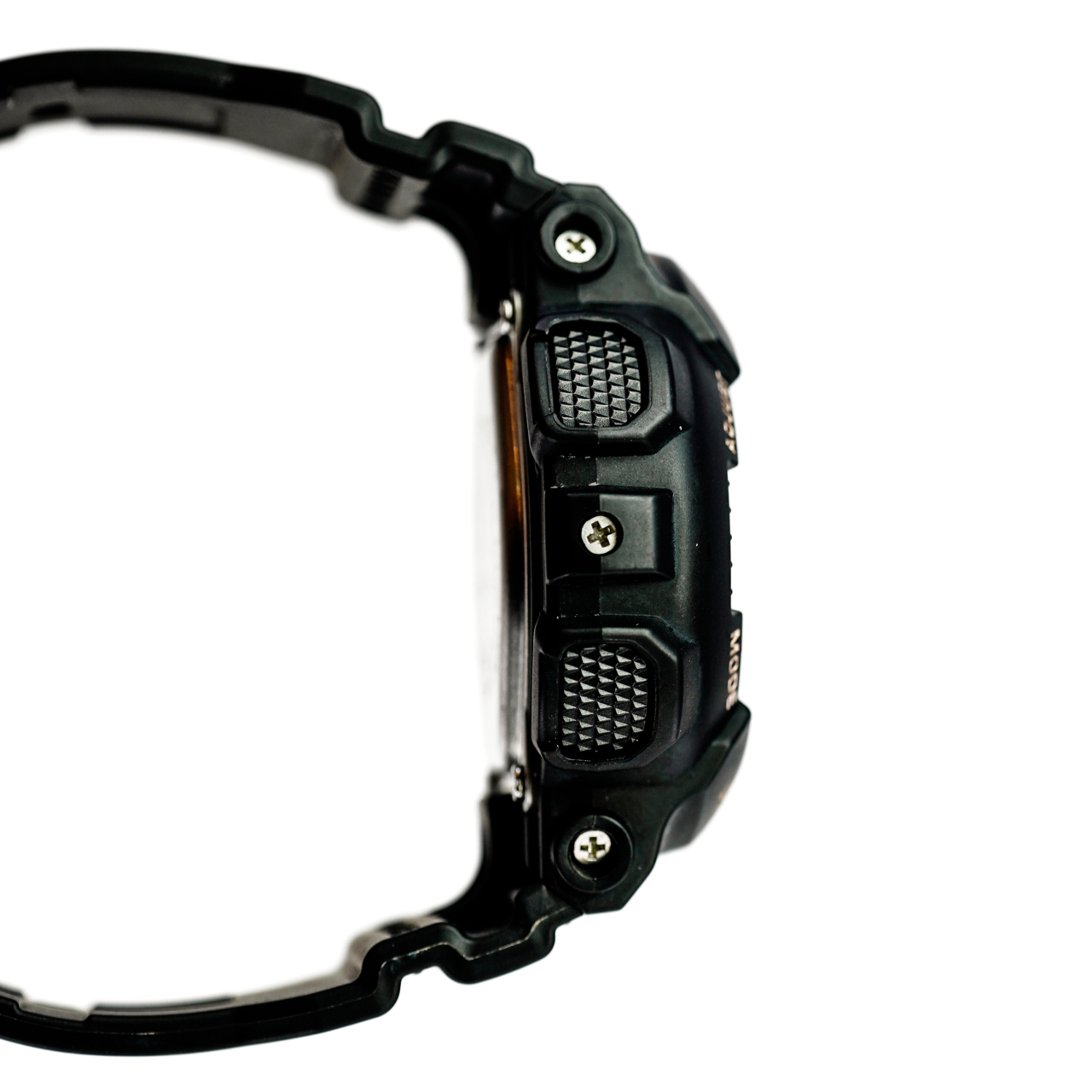 Water resistant to 100 metres and fitted with a durable resin case and band, this model is both lightweight and tough. The rose tone dial details contrast beautifully against the matte black outer case.