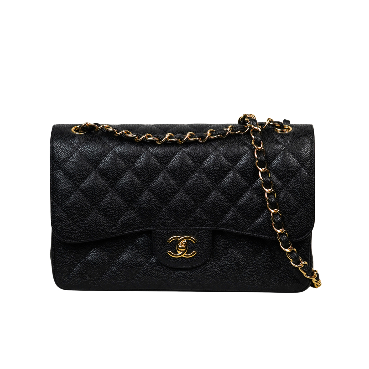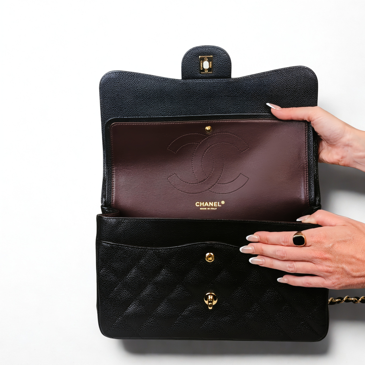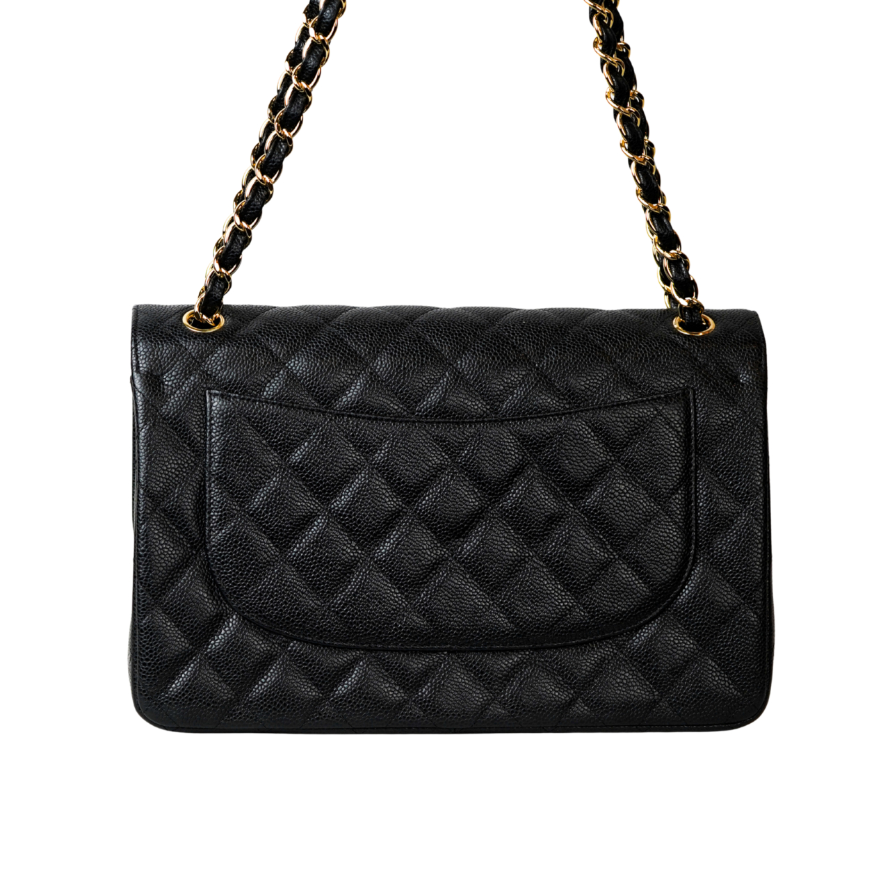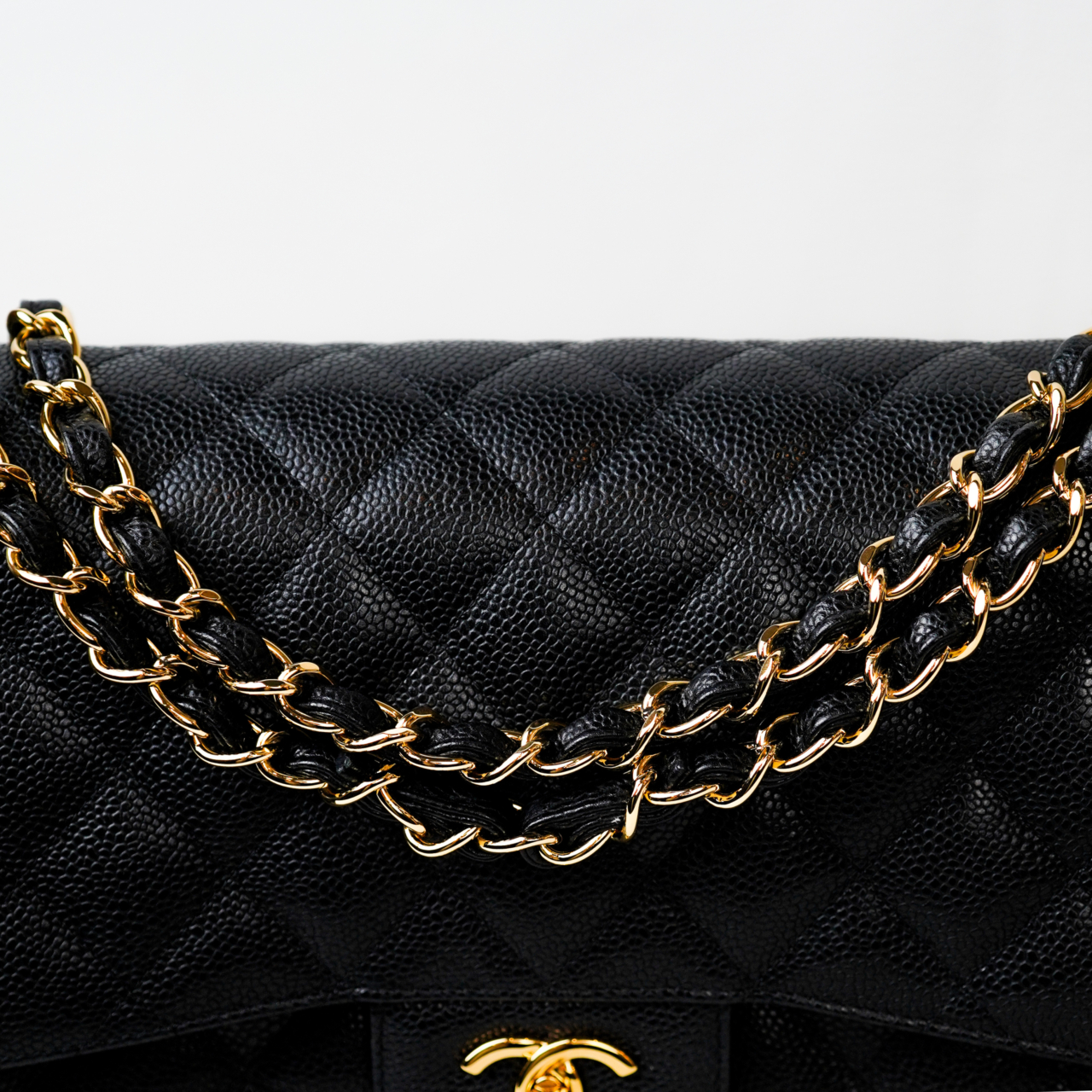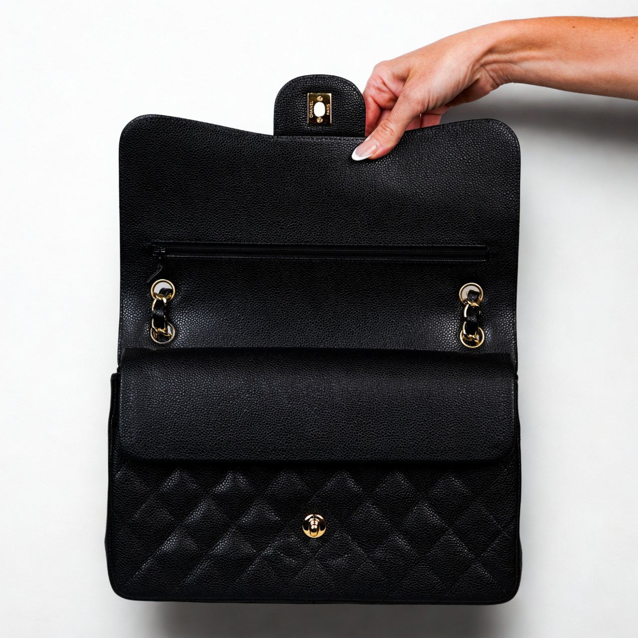 An icon for good reason, the Classic Double Flap Jumbo is one of Chanel’s most enduring designs. Crafted in black caviar leather with gold tone hardware, this piece balances everyday practicality with unmistakable Parisian elegance. The jumbo size offers generous space while maintaining the timeless silhouette collectors love.