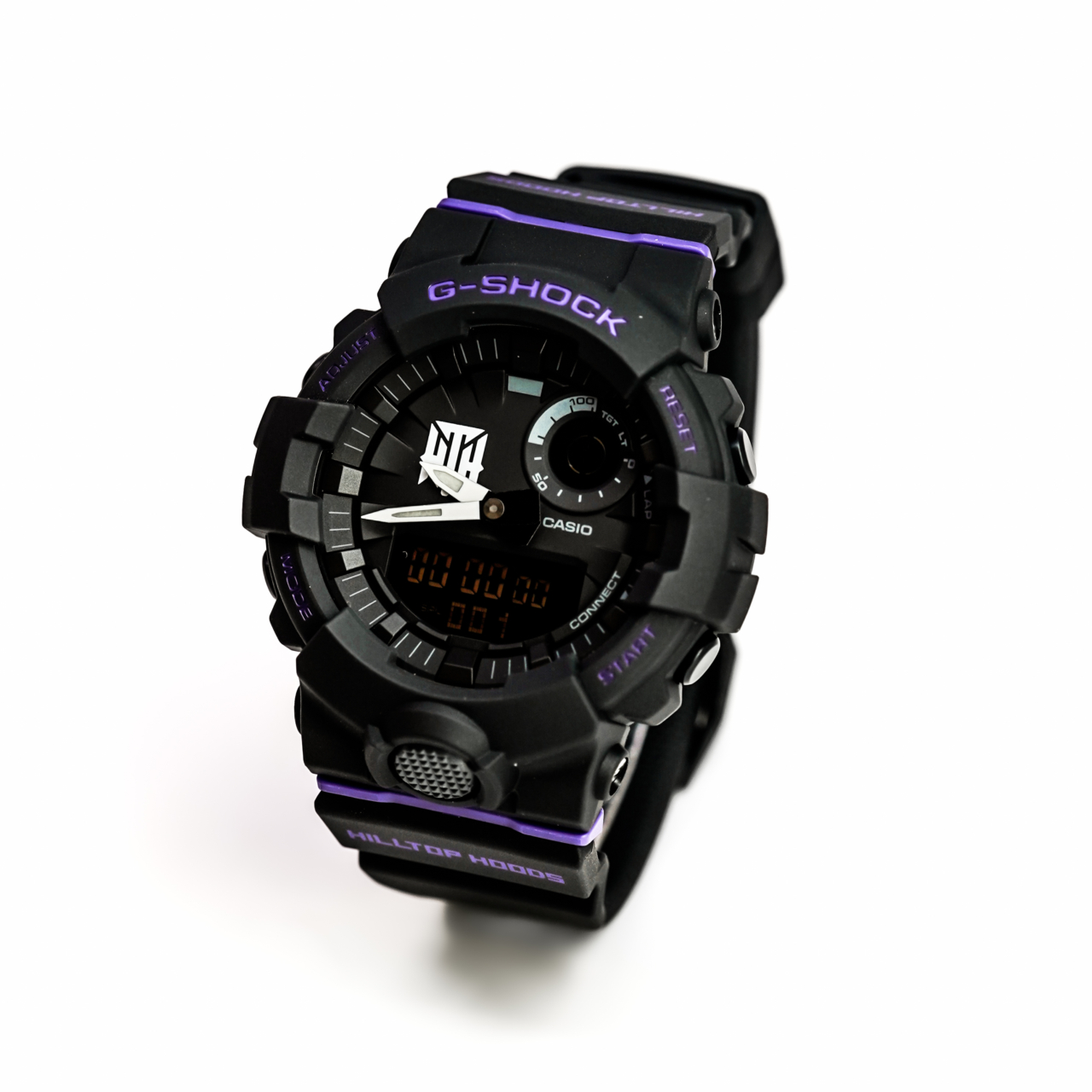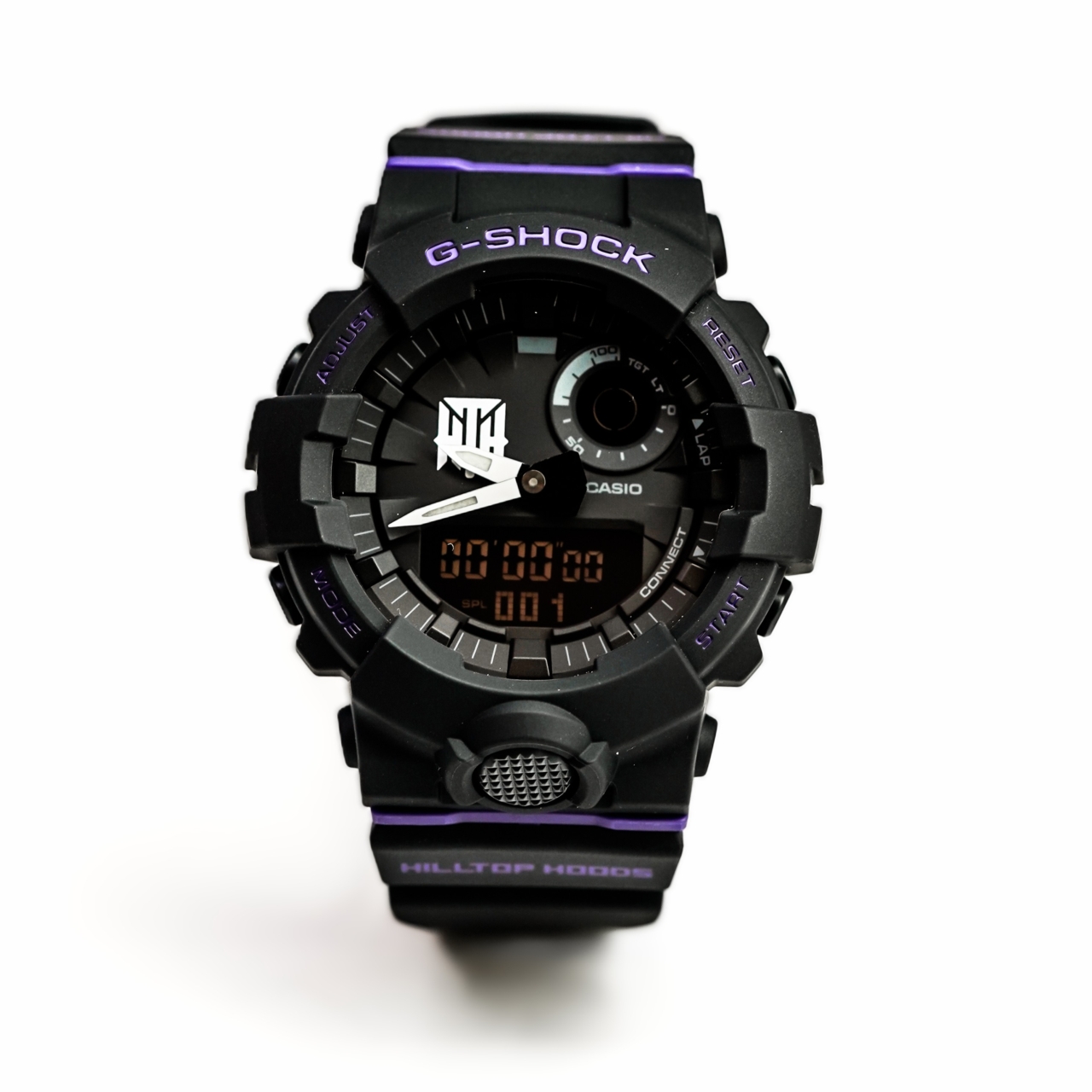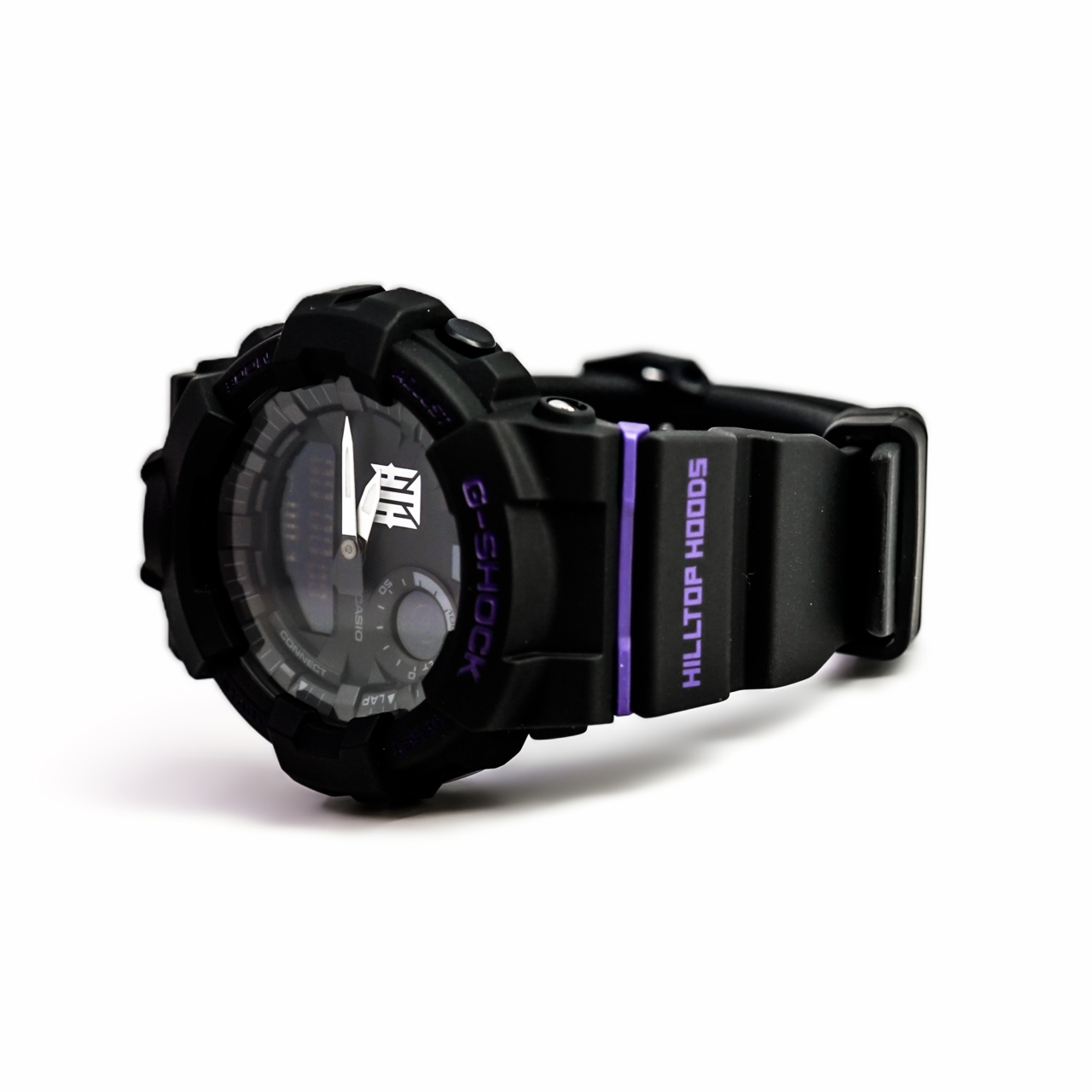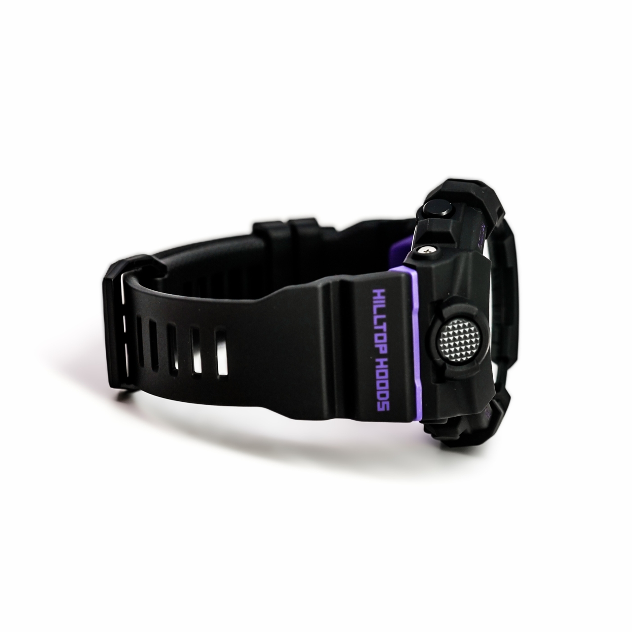 Strap: Black resin strap with purple accents and Hilltop Hoods branding