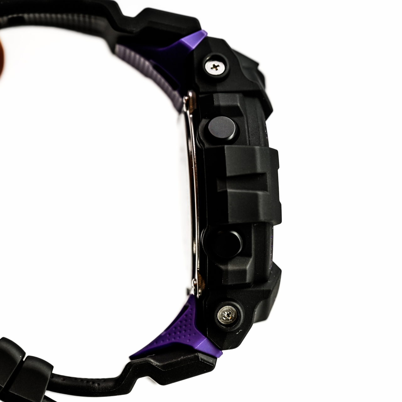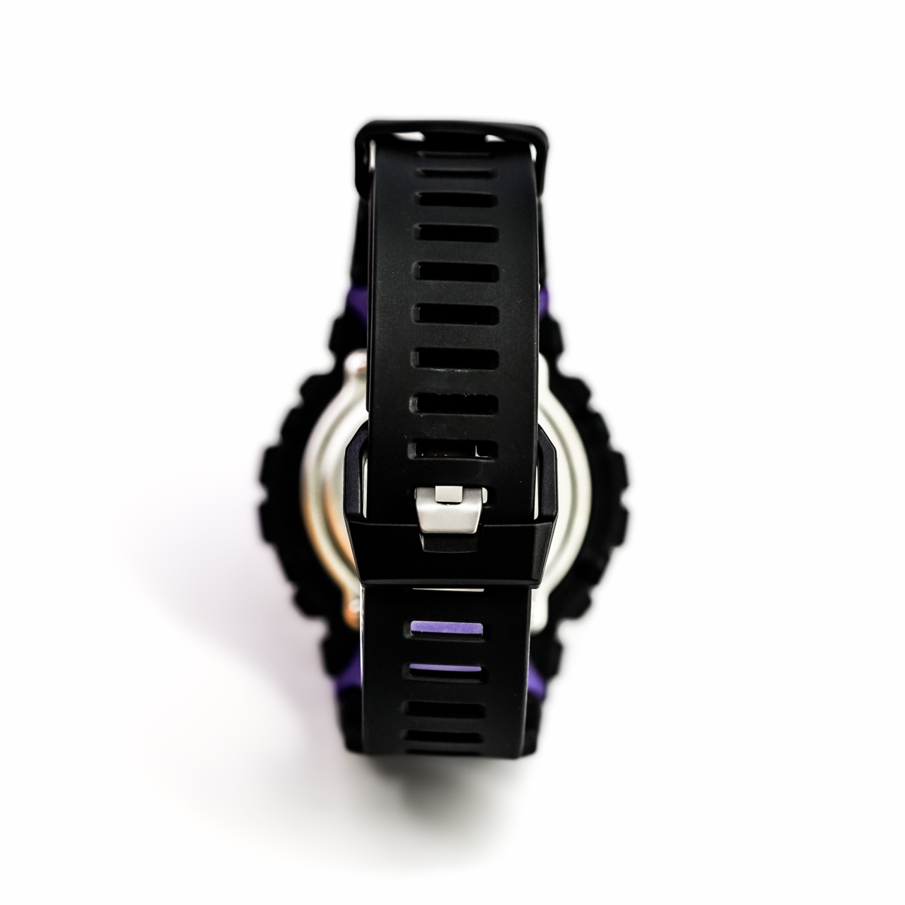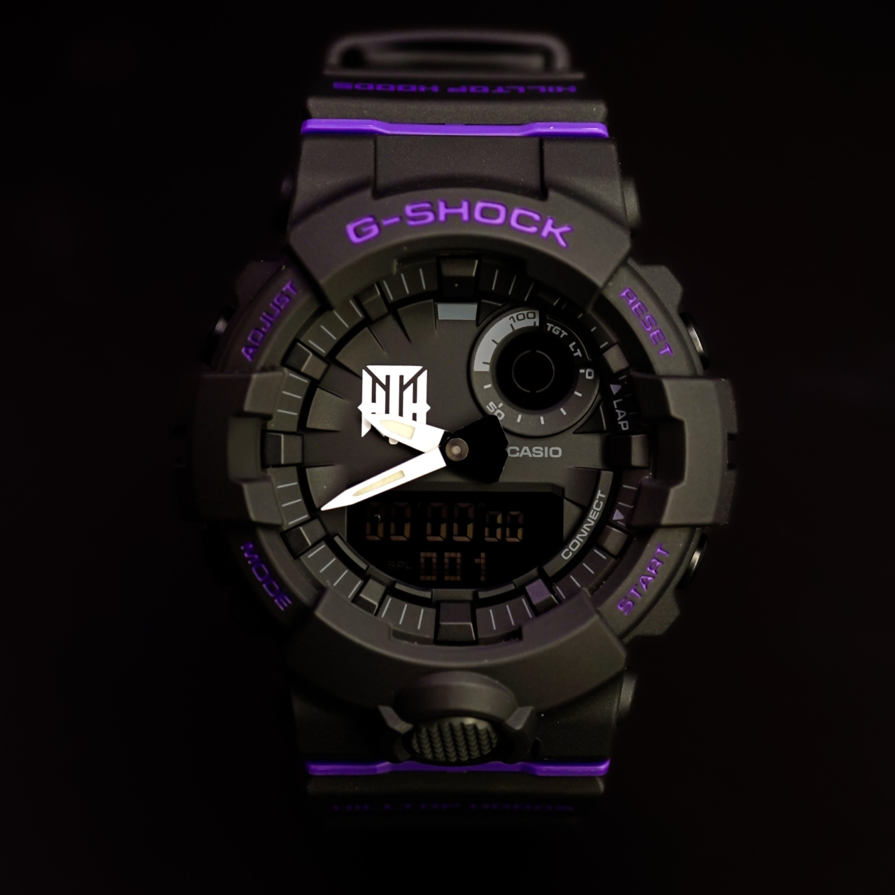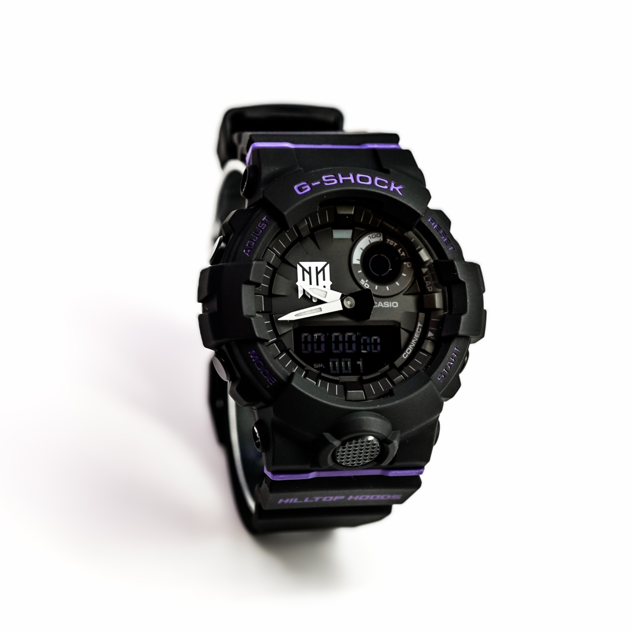 Strap: Black resin strap with purple accents and Hilltop Hoods branding