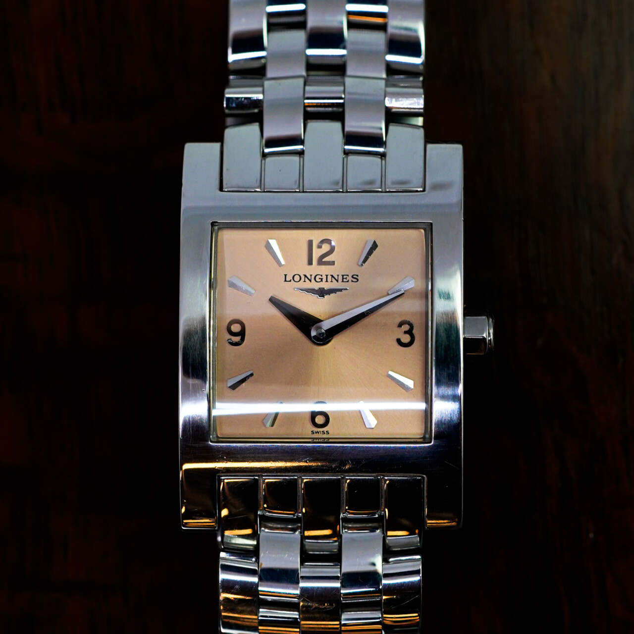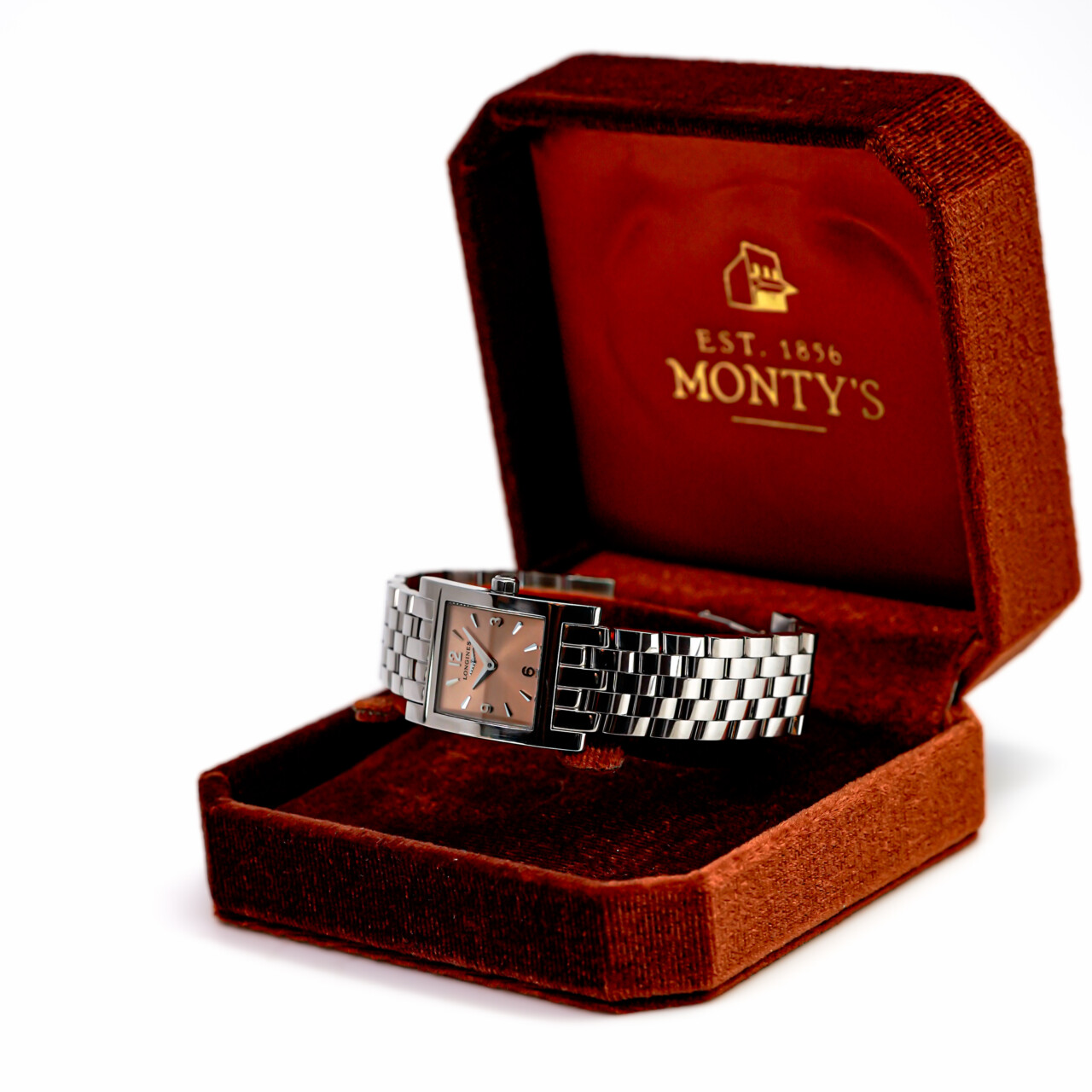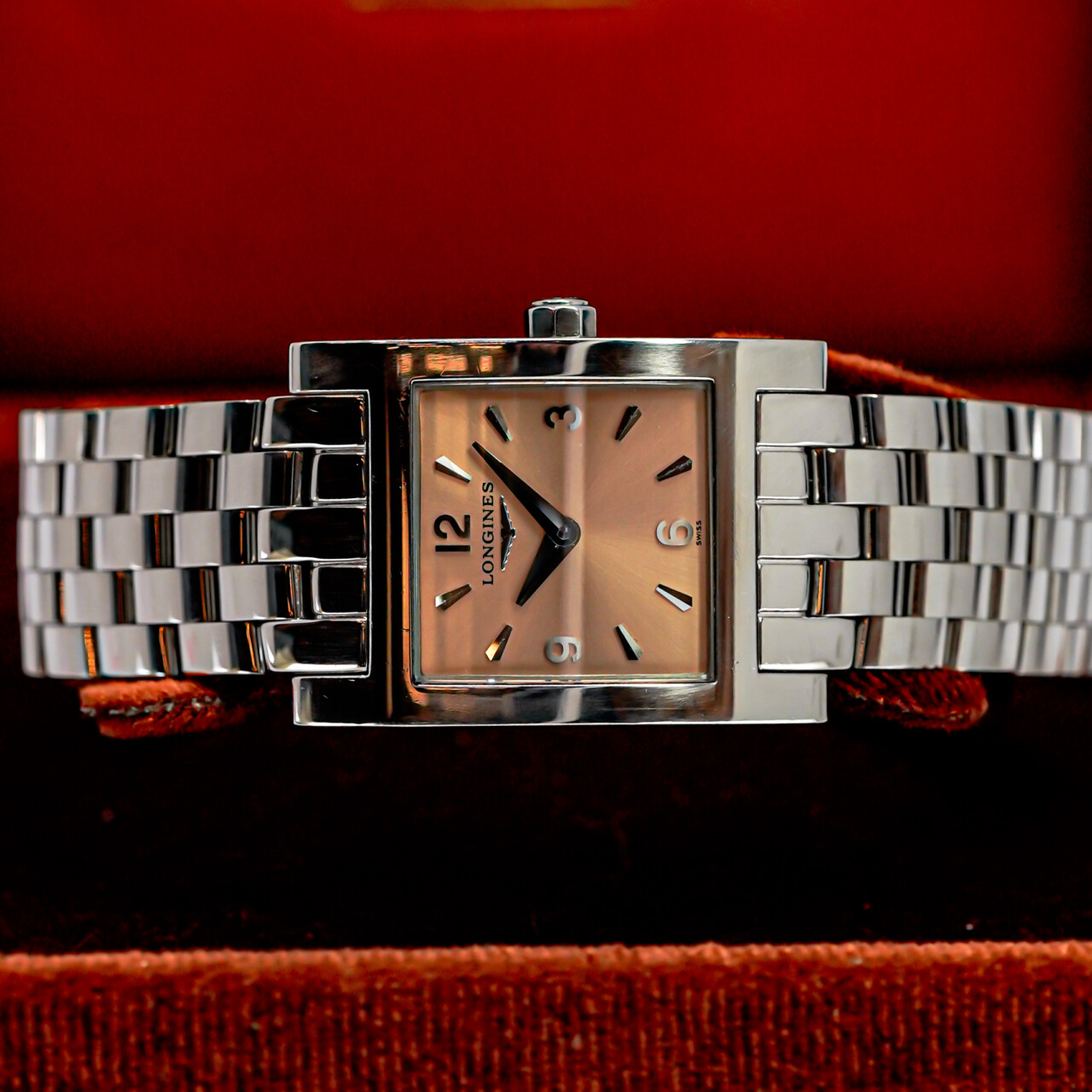 A timeless rectangular design from Longines’ iconic DolceVita collection, this refined ladies’ watch features a soft pink/rose-coloured dial paired with a polished stainless steel case and bracelet. Elegant, compact, and effortlessly wearable. This watch is pre-loved with some minor wear and fine scratches, but is in great condition overall and presents well.
