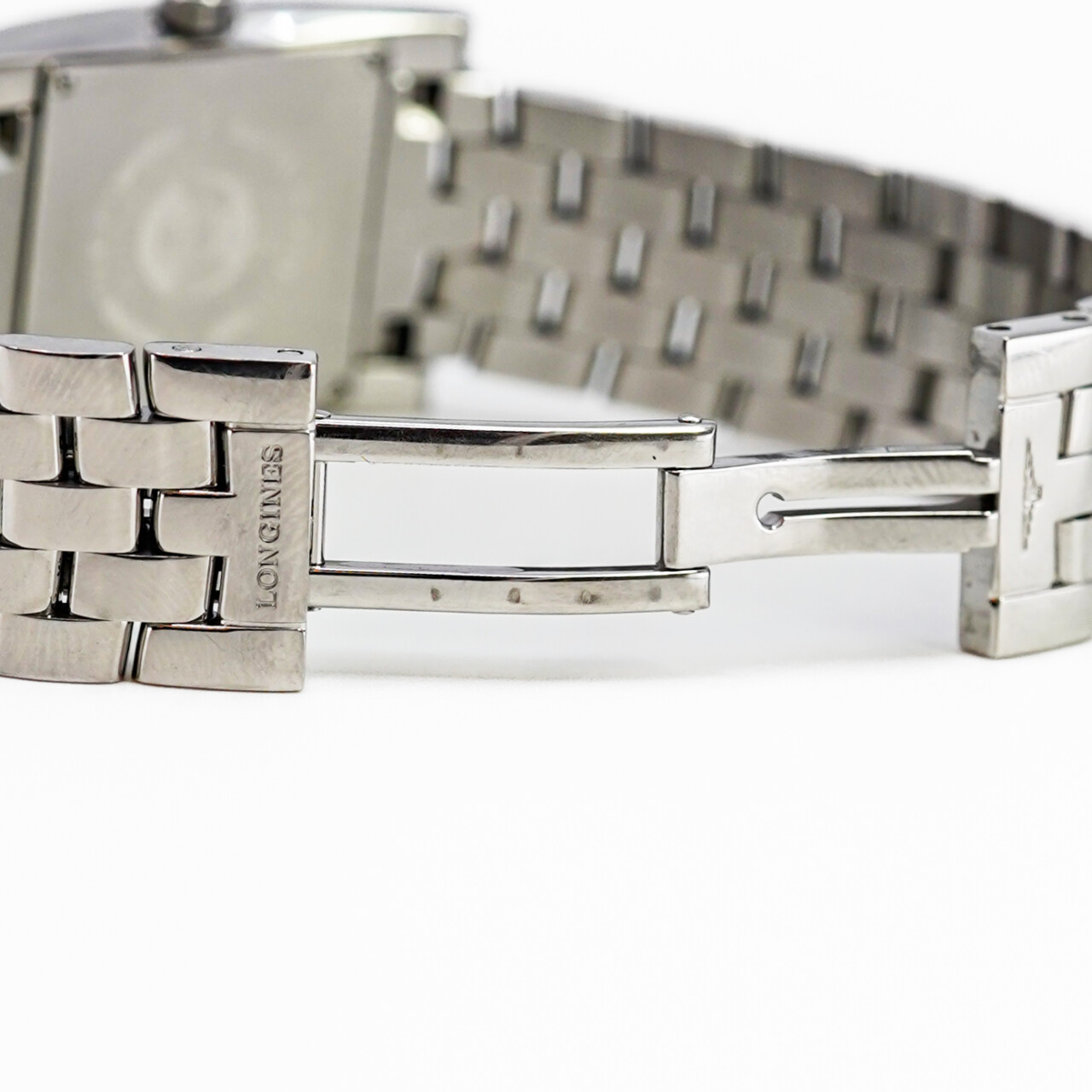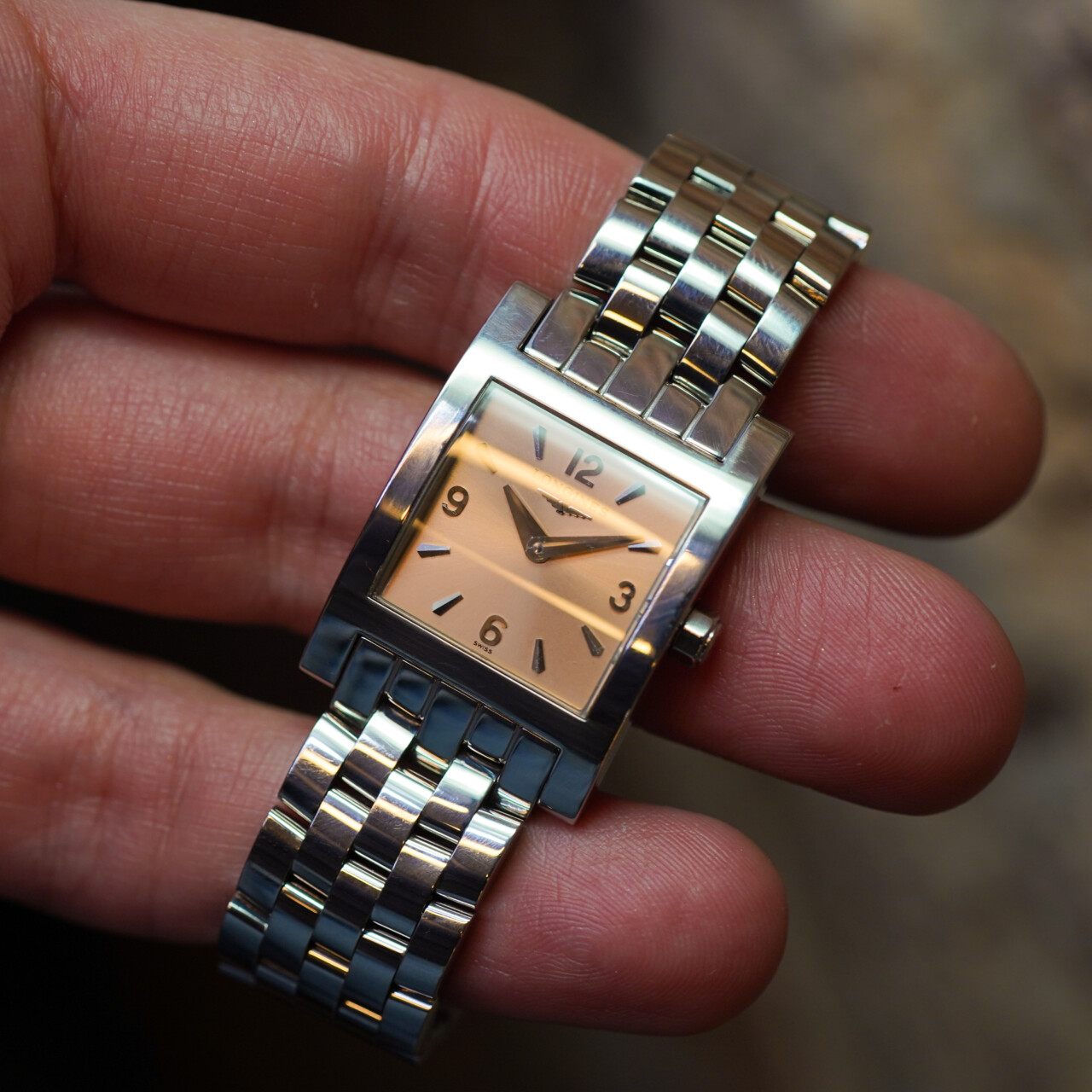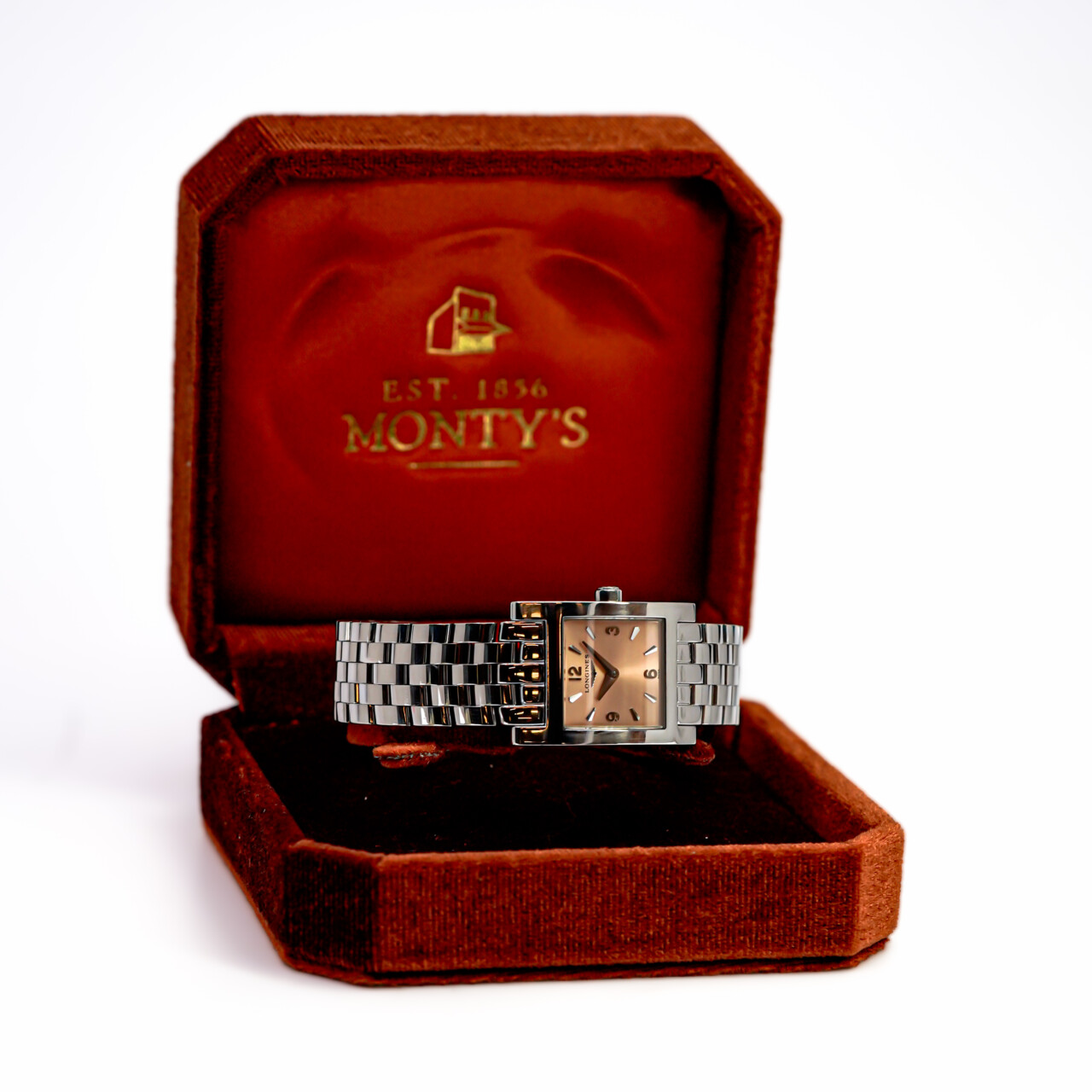 A timeless rectangular design from Longines’ iconic DolceVita collection, this refined ladies’ watch features a soft pink/rose-coloured dial paired with a polished stainless steel case and bracelet. Elegant, compact, and effortlessly wearable. This watch is pre-loved with some minor wear and fine scratches, but is in great condition overall and presents well.