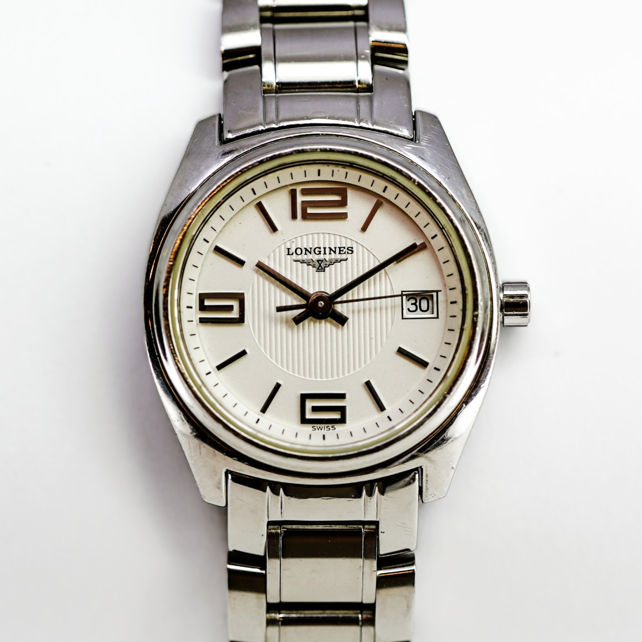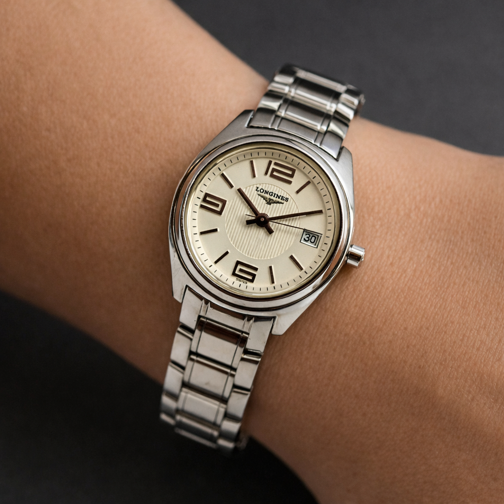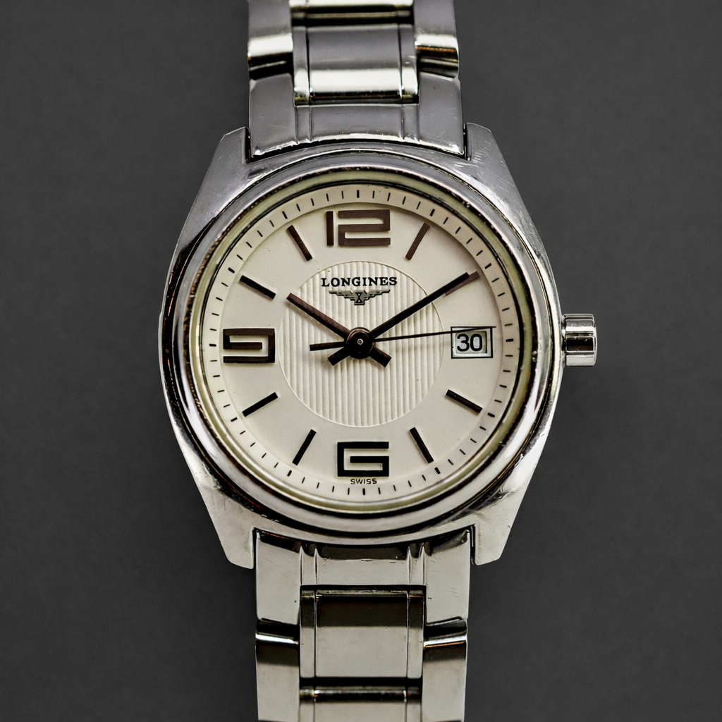 A refined and elegant pre loved Longines Lungomare, reference L3.132.4, featuring a classic 26mm stainless steel case and matching bracelet. The softly textured cream dial is accented by bold Arabic numerals at 12, 9 and 6, slim baton markers, and a practical date window at 3 o’clock.