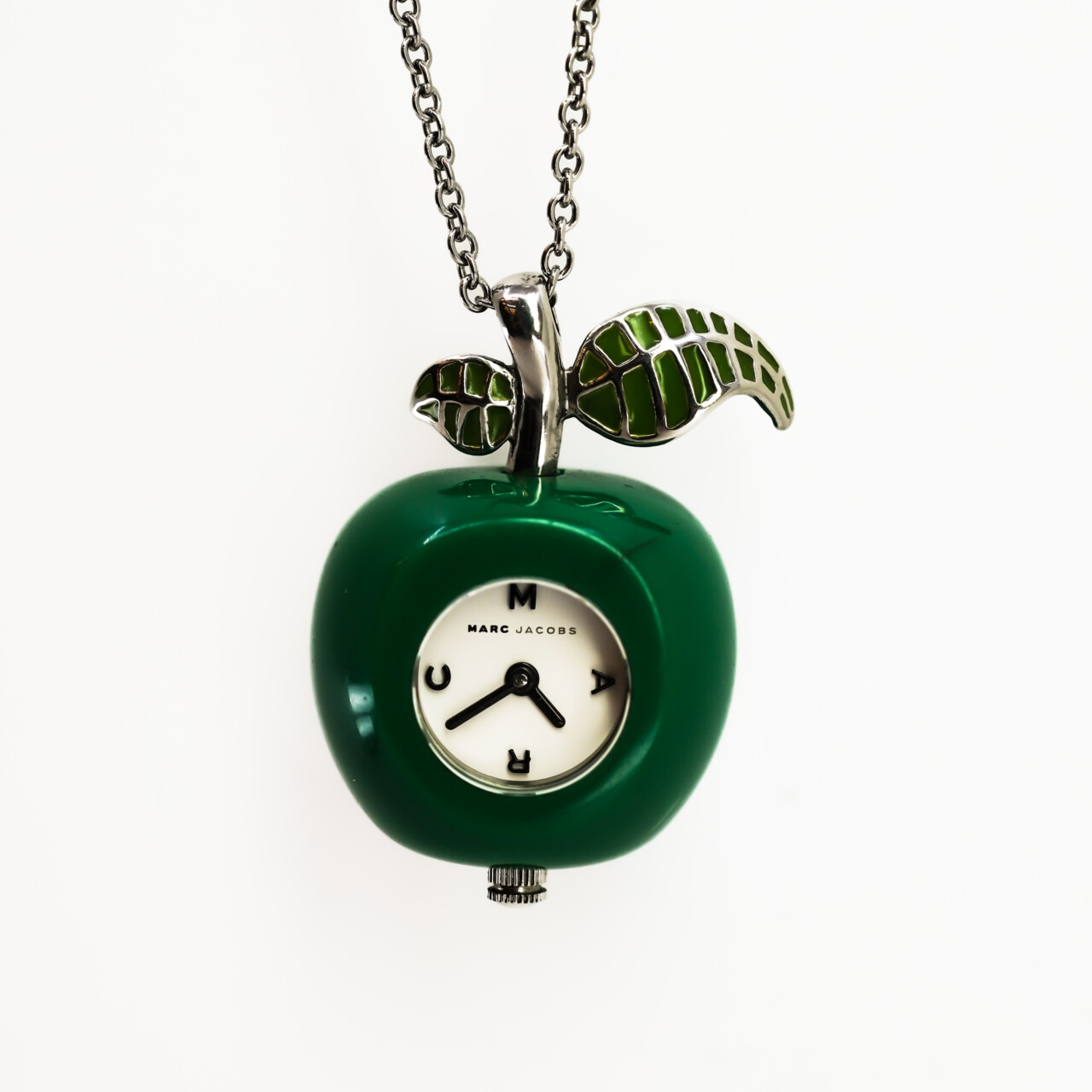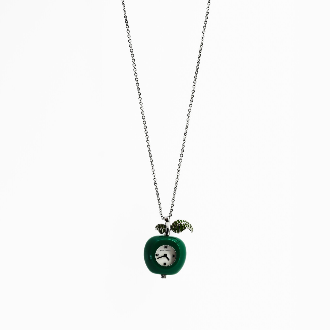 A playful yet elegant piece from Marc by Marc Jacobs, this pendant watch combines whimsical design with everyday functionality. The timepiece is shaped like a glossy green apple, complete with silver-tone stem and enamelled leaves, suspended from a long stainless steel chain.