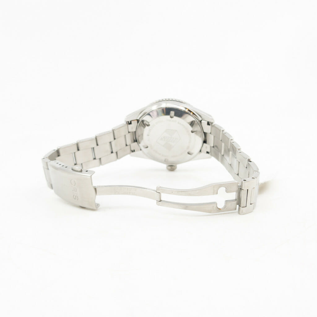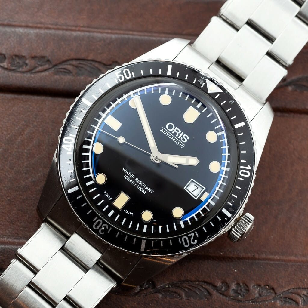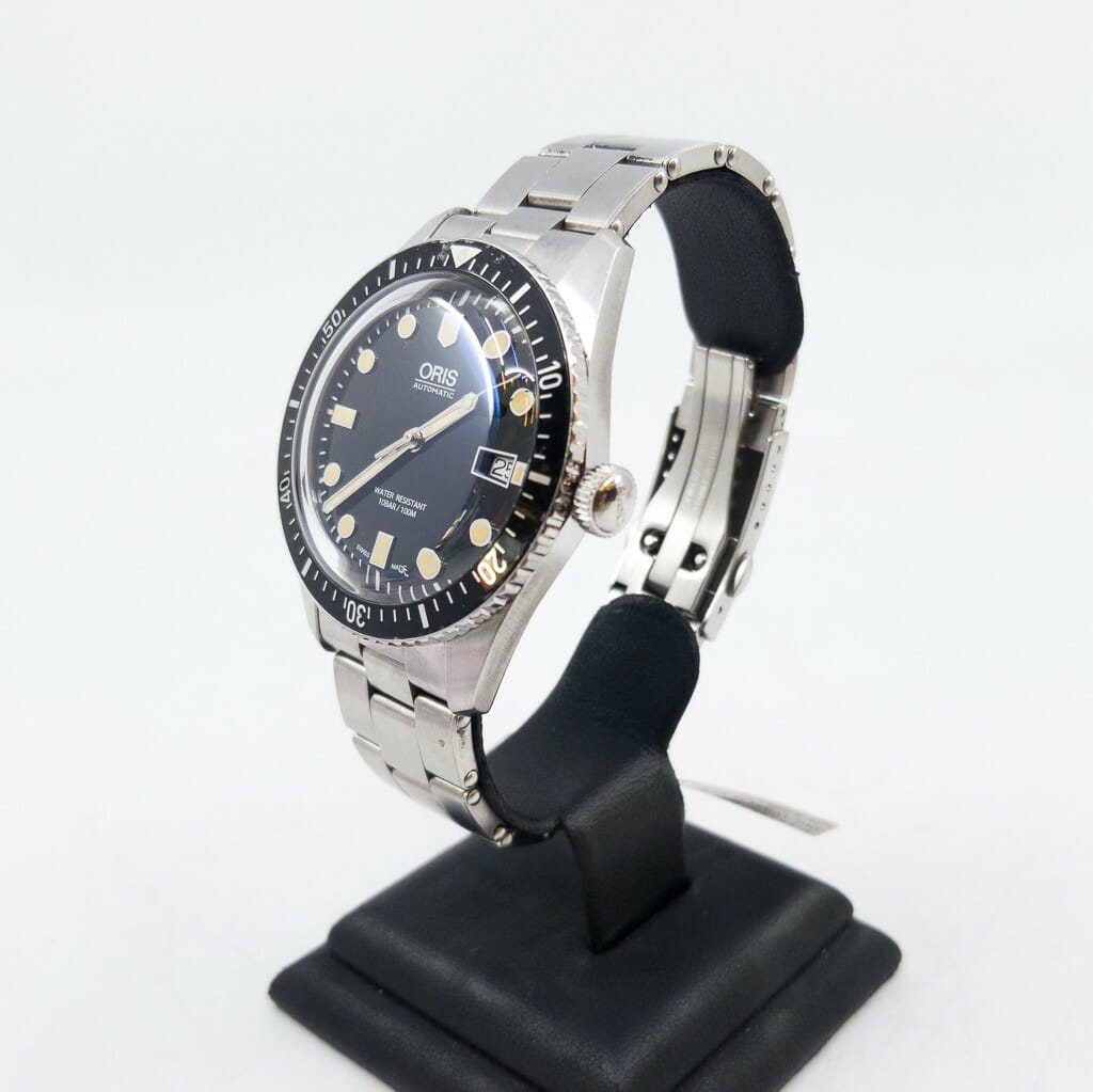 This Oris Sixty Five has a diver-esque design with refined features and black dial. The cream coloured markers add a vintage feel. It comes on the original stainless steel band with sapphire crystal glass. This watch is pre-loved, so has some wear including a dent on the bezel so we have priced it accordingly. Please see the photos for further details.