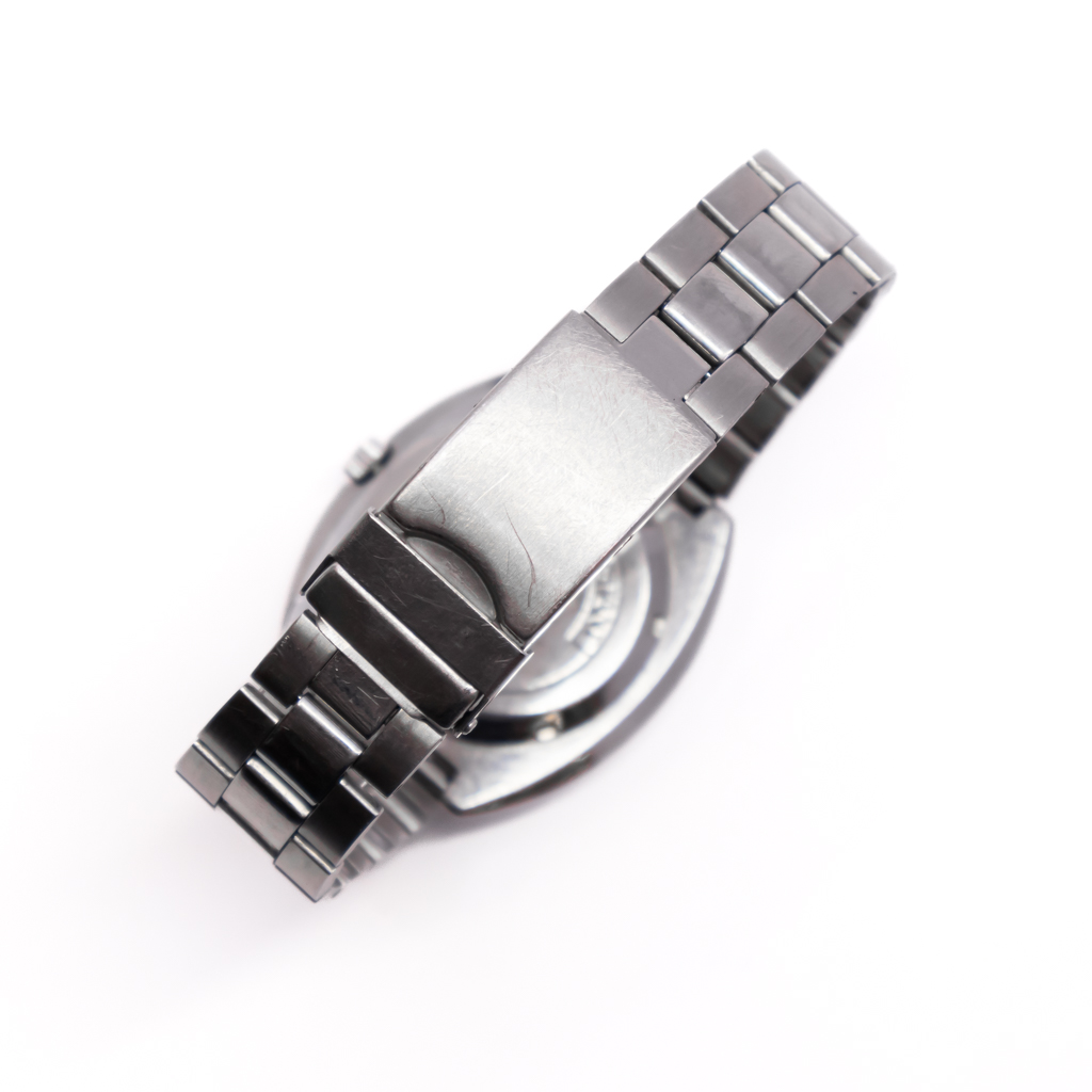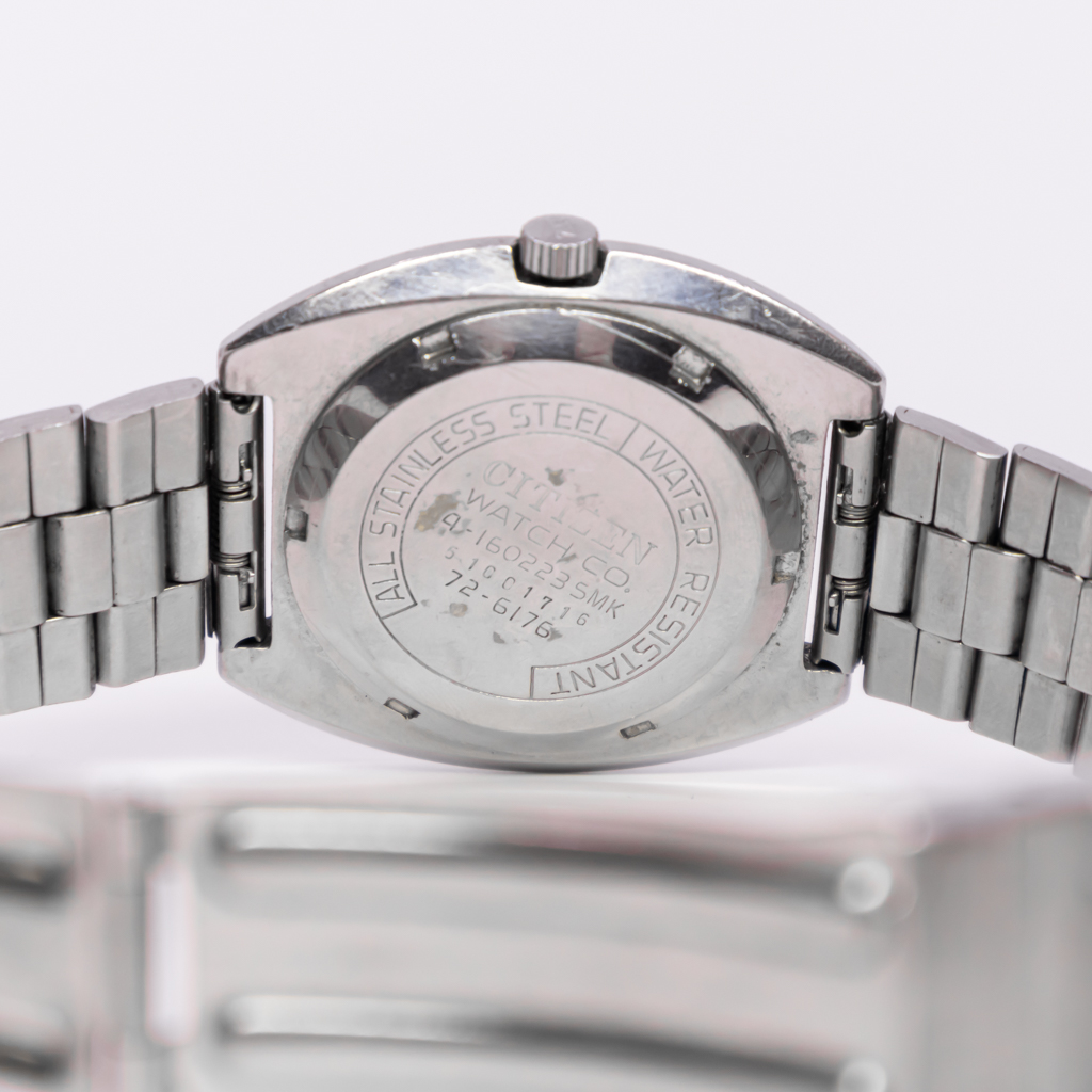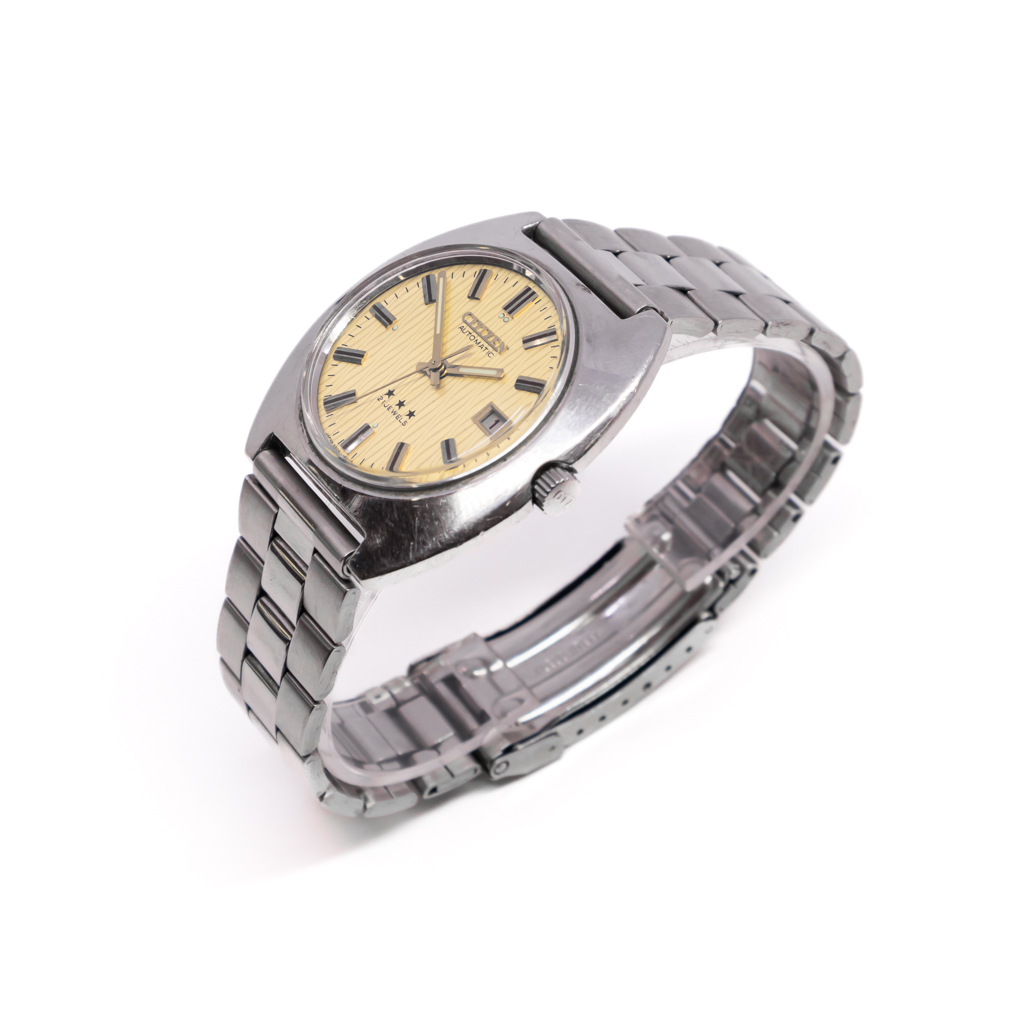 This vintage Citizen watch has a date window, automatic movement and turtle like case design. The case is 37mm and the band fits a wrist 19cm. As a vintage watch it has some character and fine scratches to the case and band but the glass has been replaced. It is a really cool retro piece.