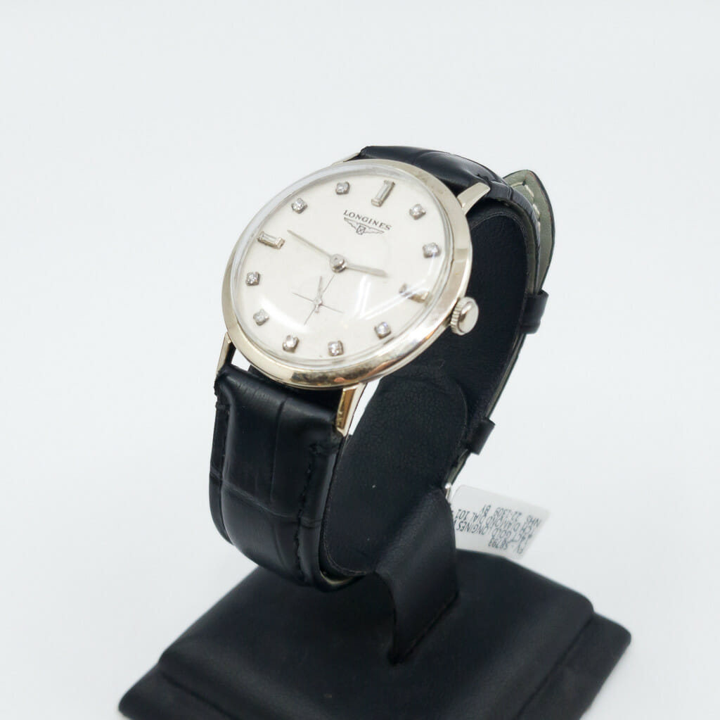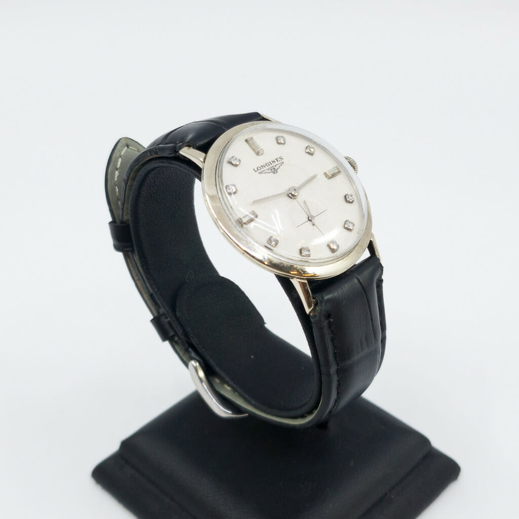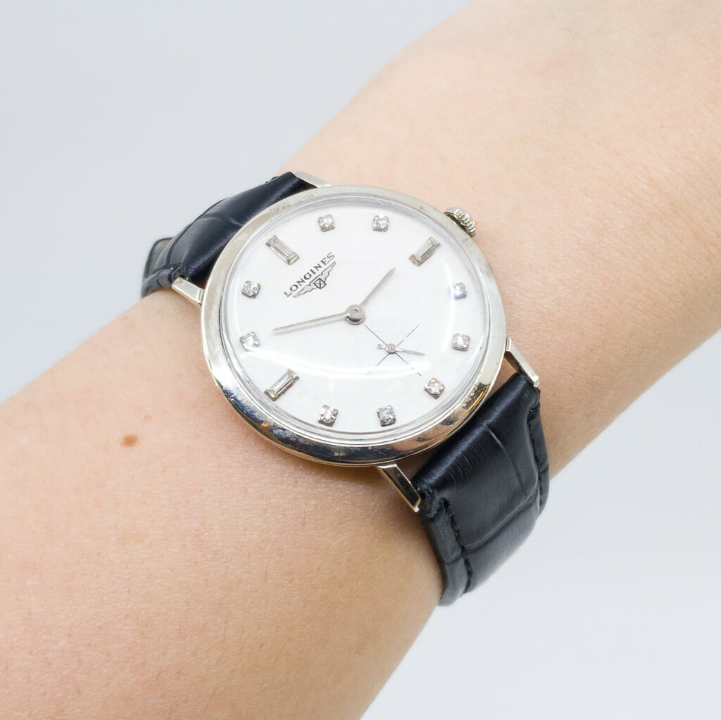 This vintage Longines has a 14ct white gold case with diamond set dial. It has a manual movement and black leather band. As a vintage watch it has some wear/age from time and use but is in great condition overall. Please see the photos.