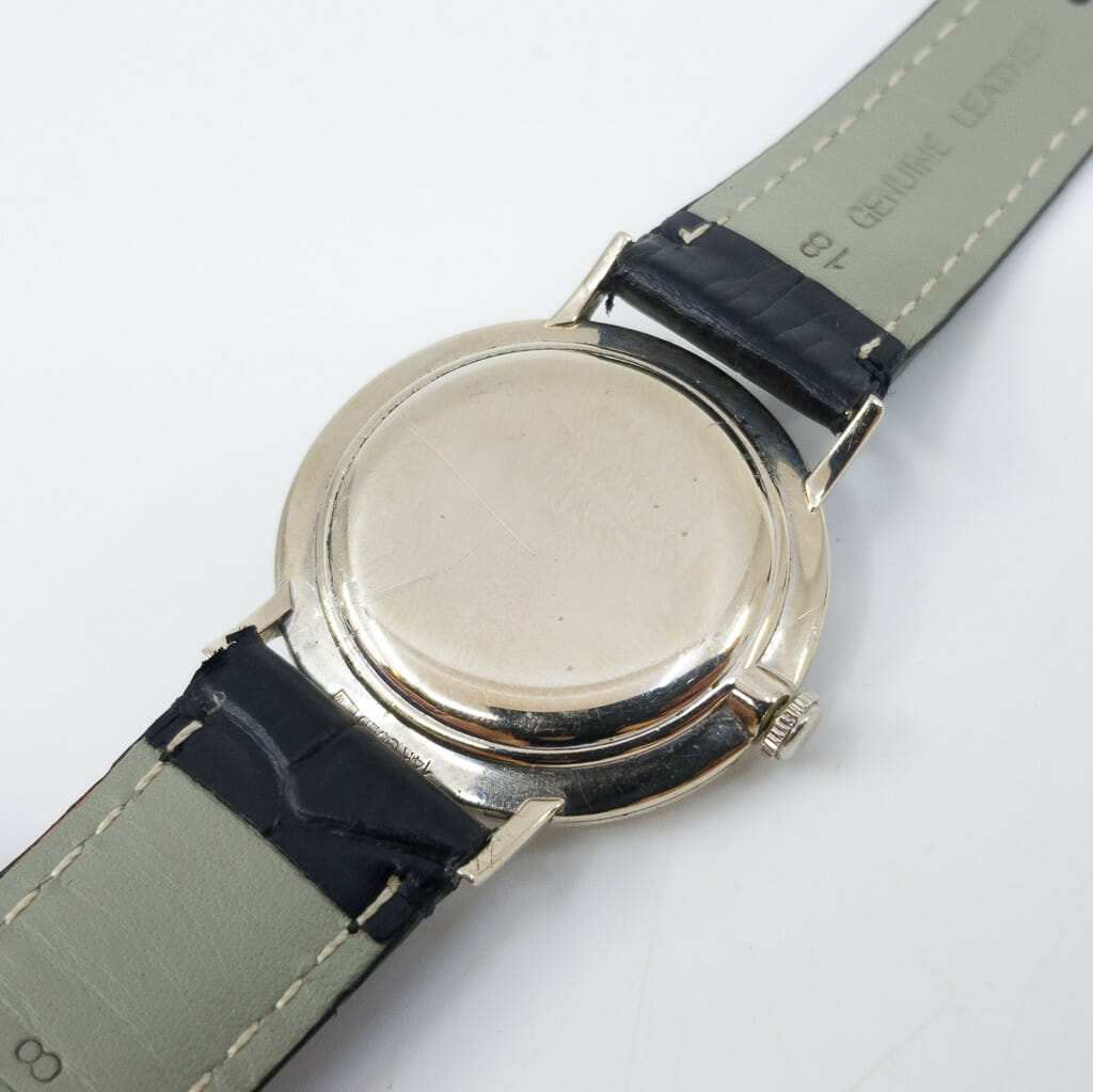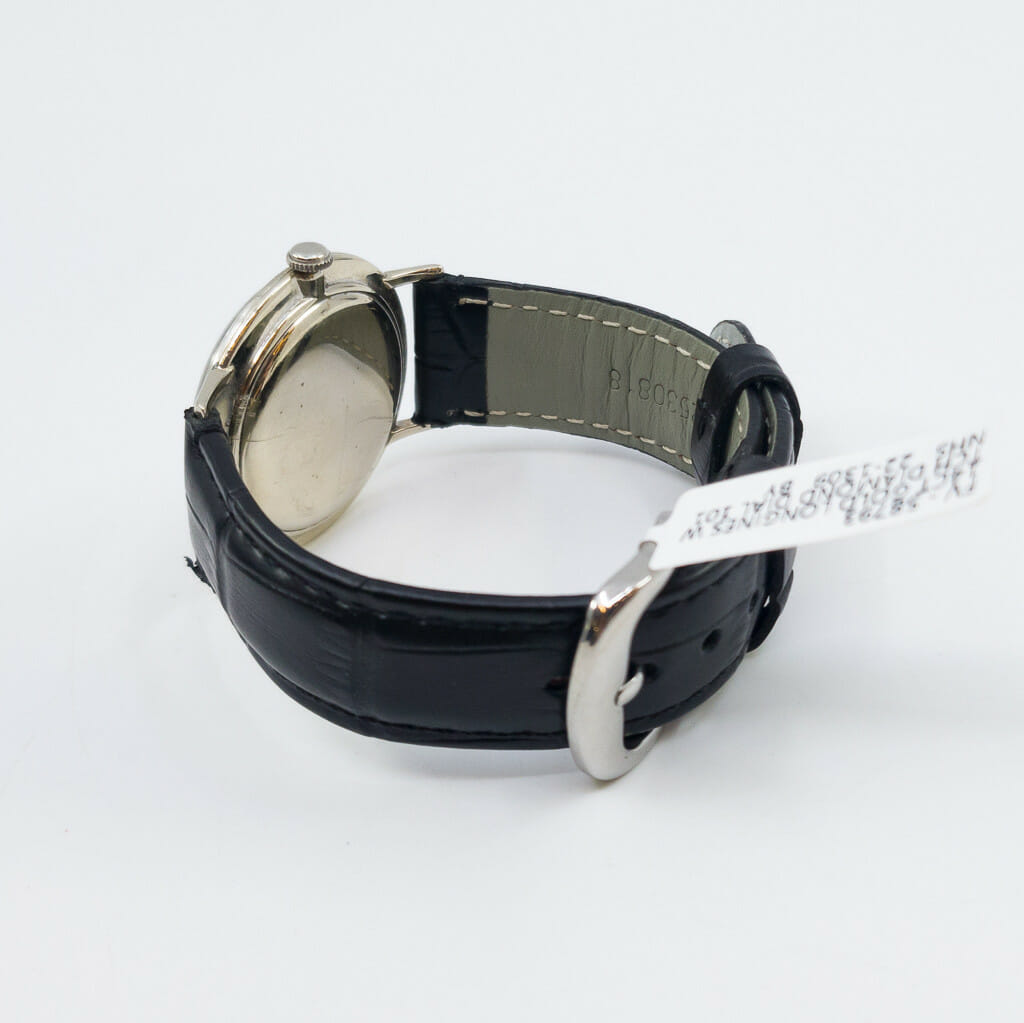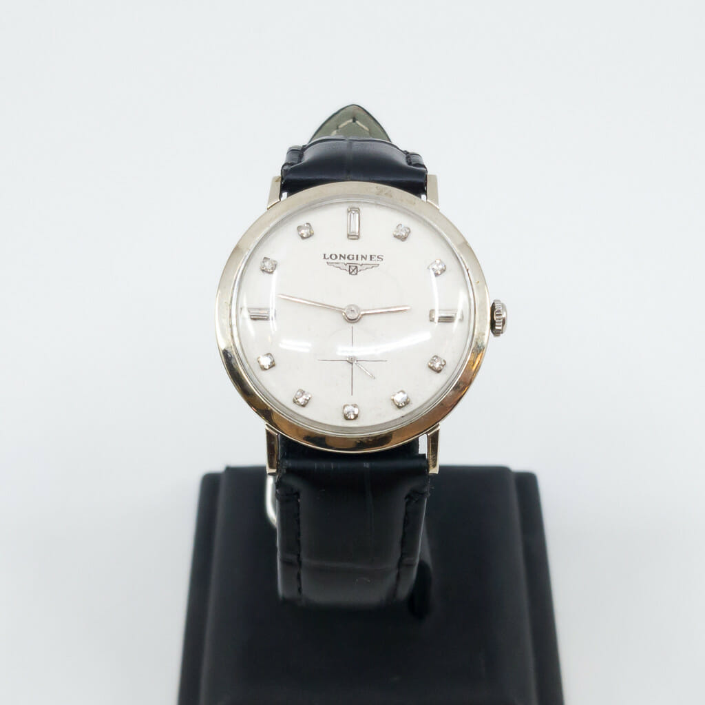 This vintage Longines has a 14ct white gold case with diamond set dial. It has a manual movement and black leather band. As a vintage watch it has some wear/age from time and use but is in great condition overall. Please see the photos.