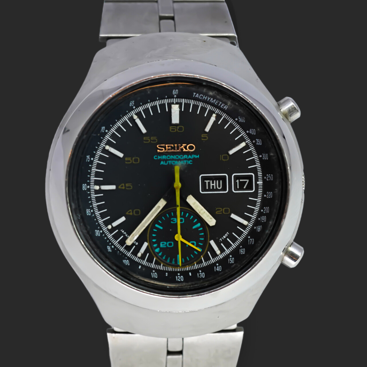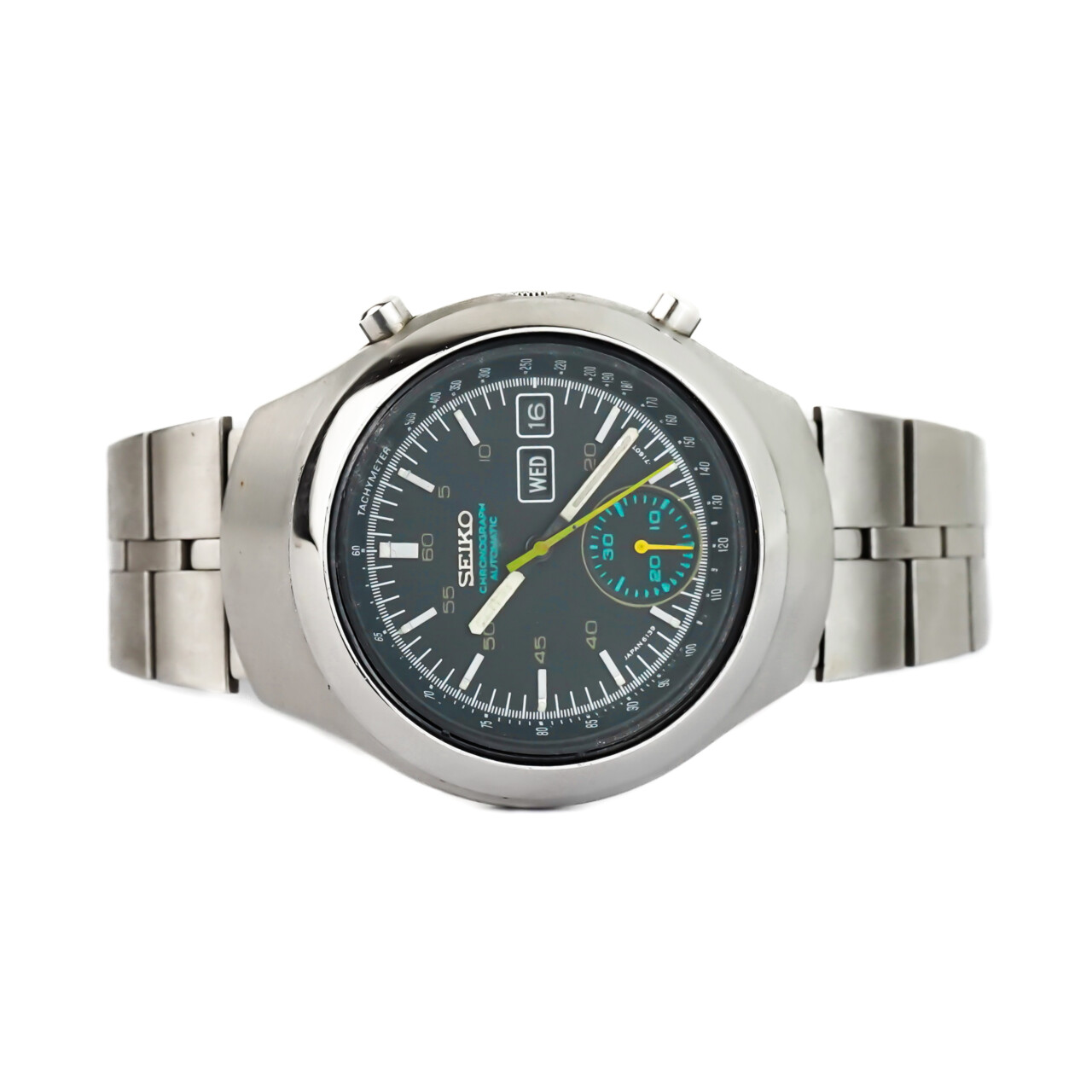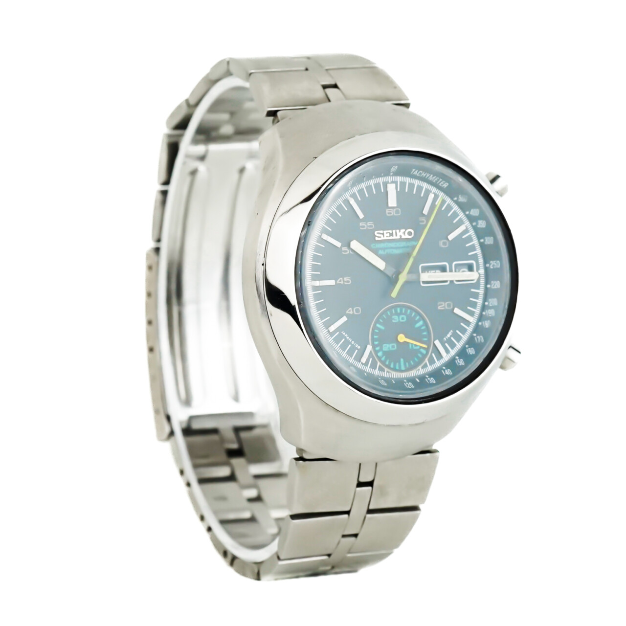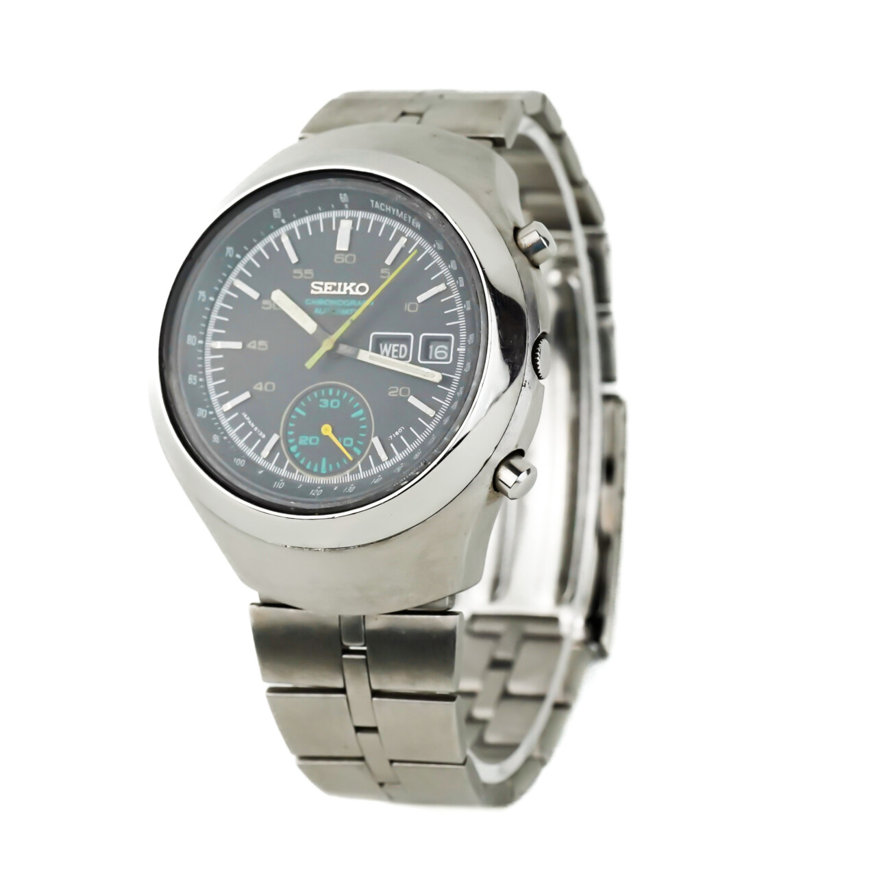 A bold and distinctive timepiece from Seiko’s golden era of automatic chronographs, the 6139-7100—nicknamed the “Helmet” for its uniquely shaped case—delivers vintage character with serious retro appeal. Produced circa 1976, this model features Seiko’s in-house calibre 6139 movement, one of the world’s first automatic chronograph calibres.