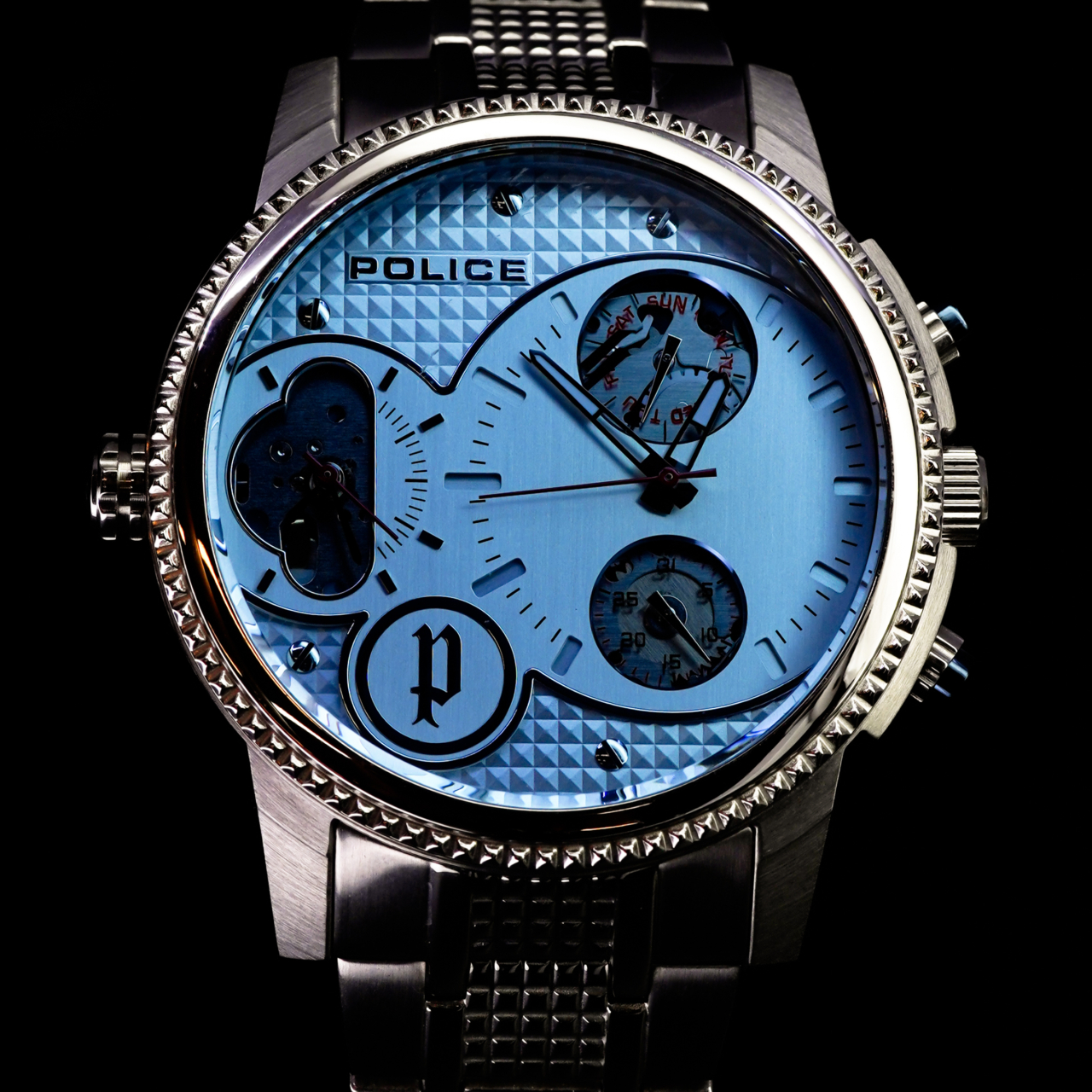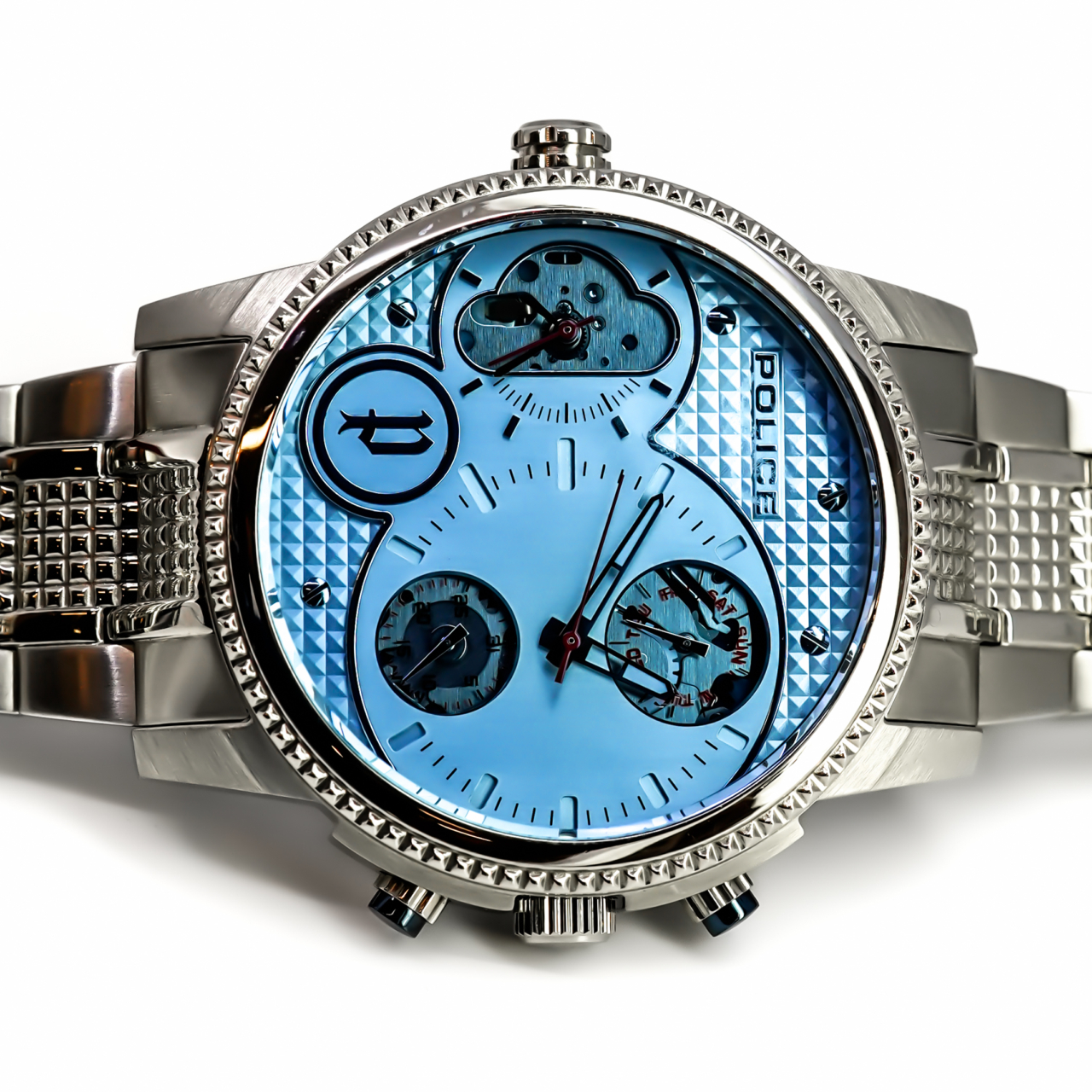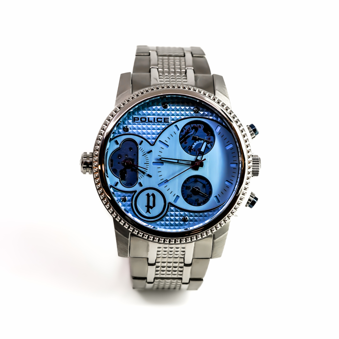 Finished on a solid stainless steel bracelet with a signed Police clasp, this watch has real wrist presence and is designed to stand out rather than blend in.